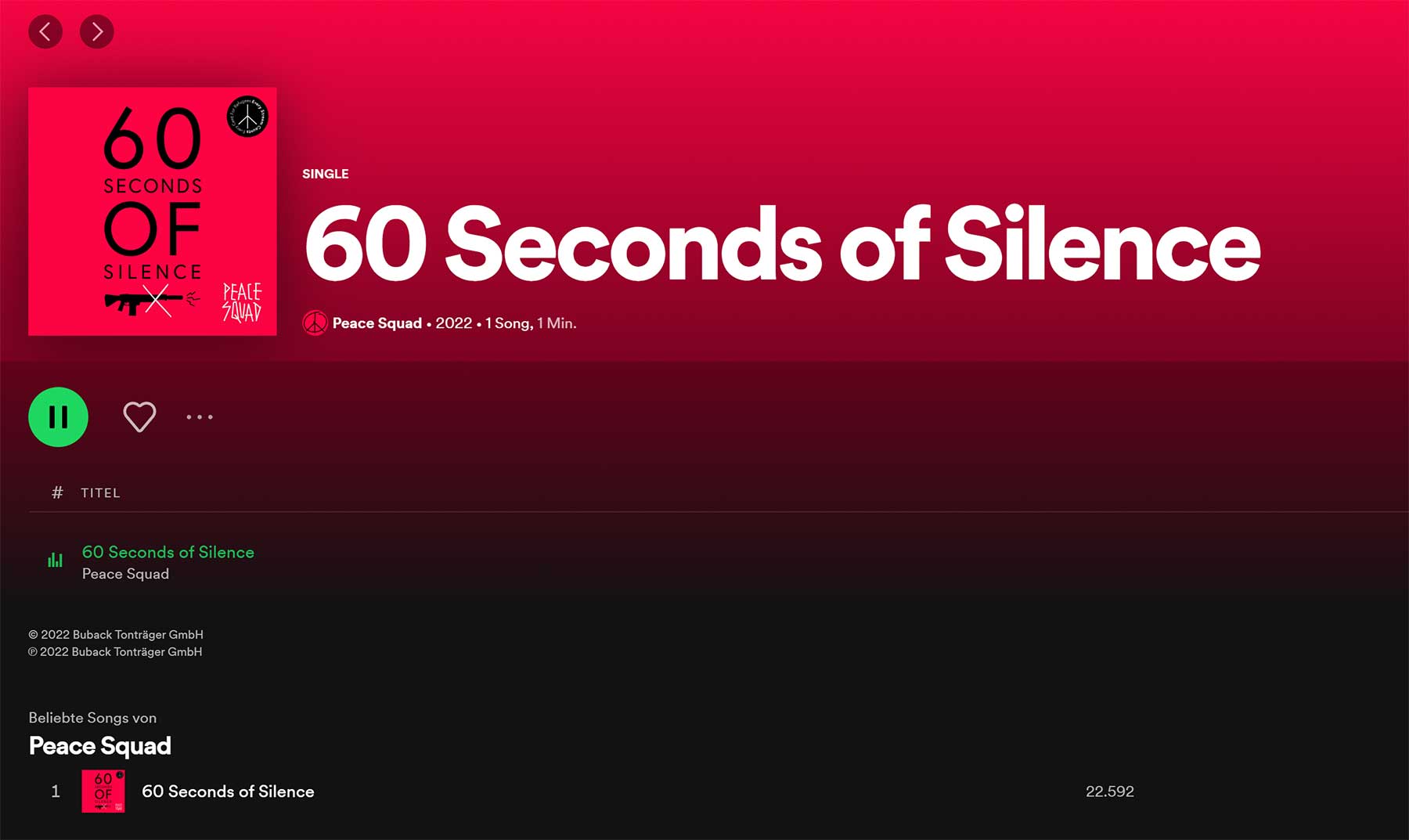 „Ein stiller Song – 60 Sekunden Schweigen, mit denen die Peace Squad ein Zeichen setzt: Weil auch die Waffen schweigen müssen. Weil wir den sinnlos ermordeten Menschen gedenken wollen. Weil der Krieg uns die Sprache verschlägt. Bist du dabei? Dann hör dir den stillen Song an.“