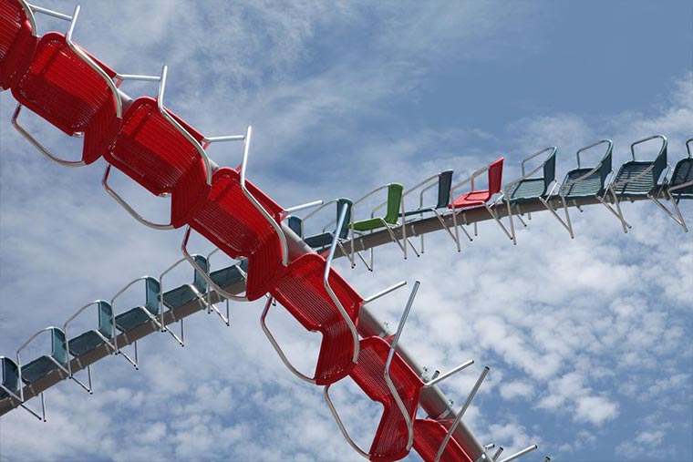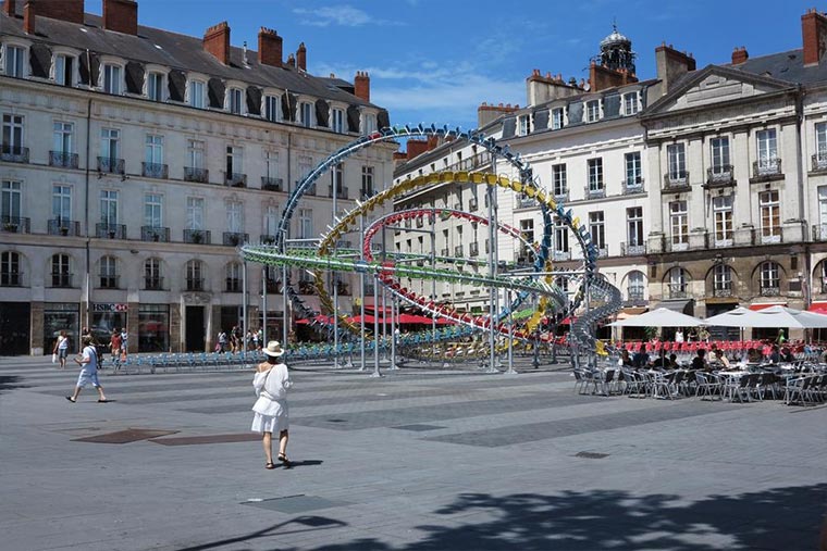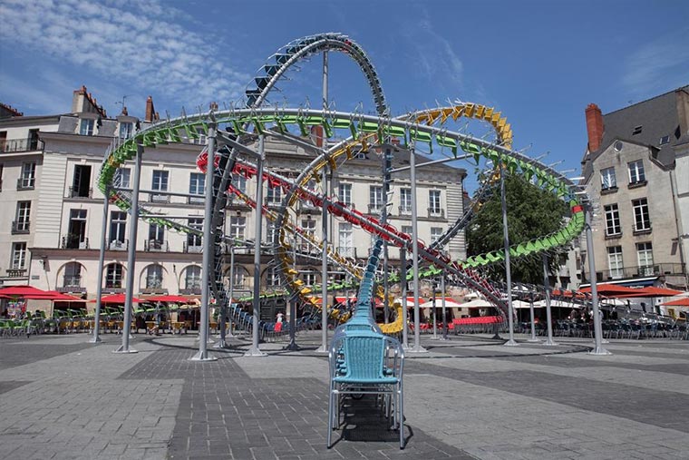 Auf den ersten Blick denkt man, da hätte jemand eine Achterbahn mitten in der Stadt aufgebaut. Dabei hat Baptiste Debombourg einfach nur ein paar Stühle aneinander gereiht. „Ein paar“ bedeutet 1.200 Stück auf 300 Meter Stahlrohr, mitten auf den Bouffay-Platz im französischen Nantes. Noch bis 30. August wird die Café-Stuhl-Installation namens Stellar zu sehen sein.