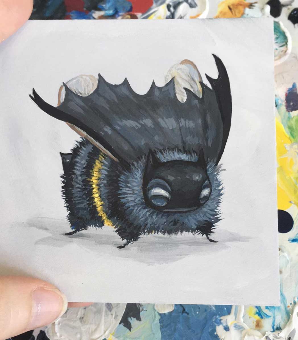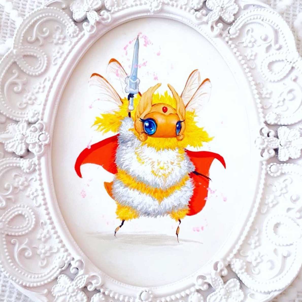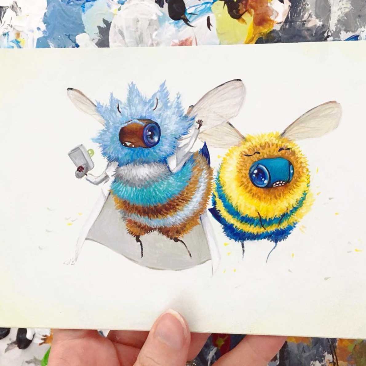 Camilla d’Errico malt gerne süße Tierchen und möchte die Biene ein bisschen mehr ins Rampenlicht rücken. Erfolgreich schafft sie das zuletzt mit einer fortlaufenden Reihe an „bienifizierten“ Popkulturfiguren. Aber neben „Beekachu“, „Bat-Bee“ und Co. sind auch die einfach nur farbig gestalteten Regenbogen-Bienen einfach nur zuckersüß geraten.