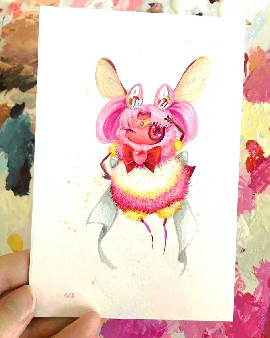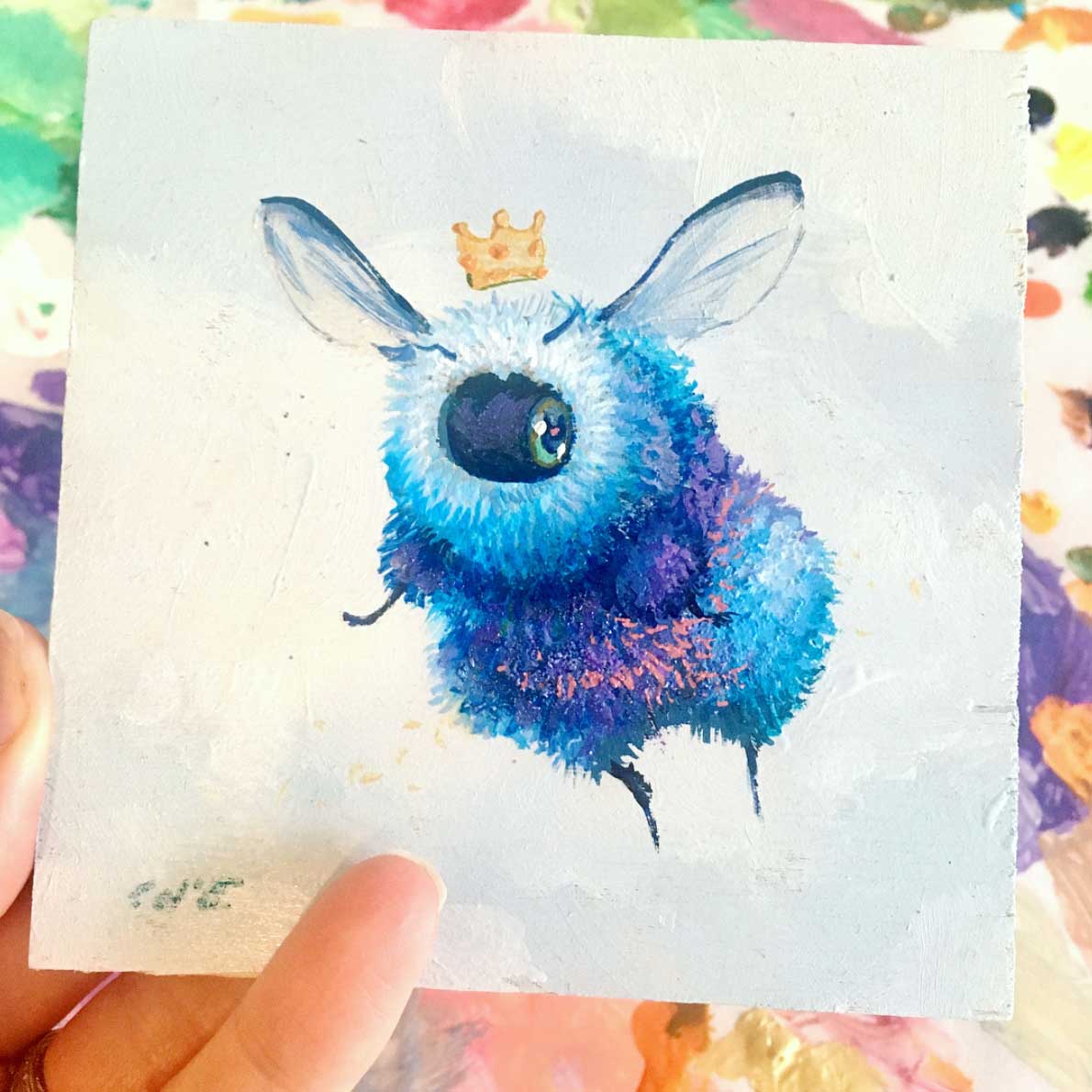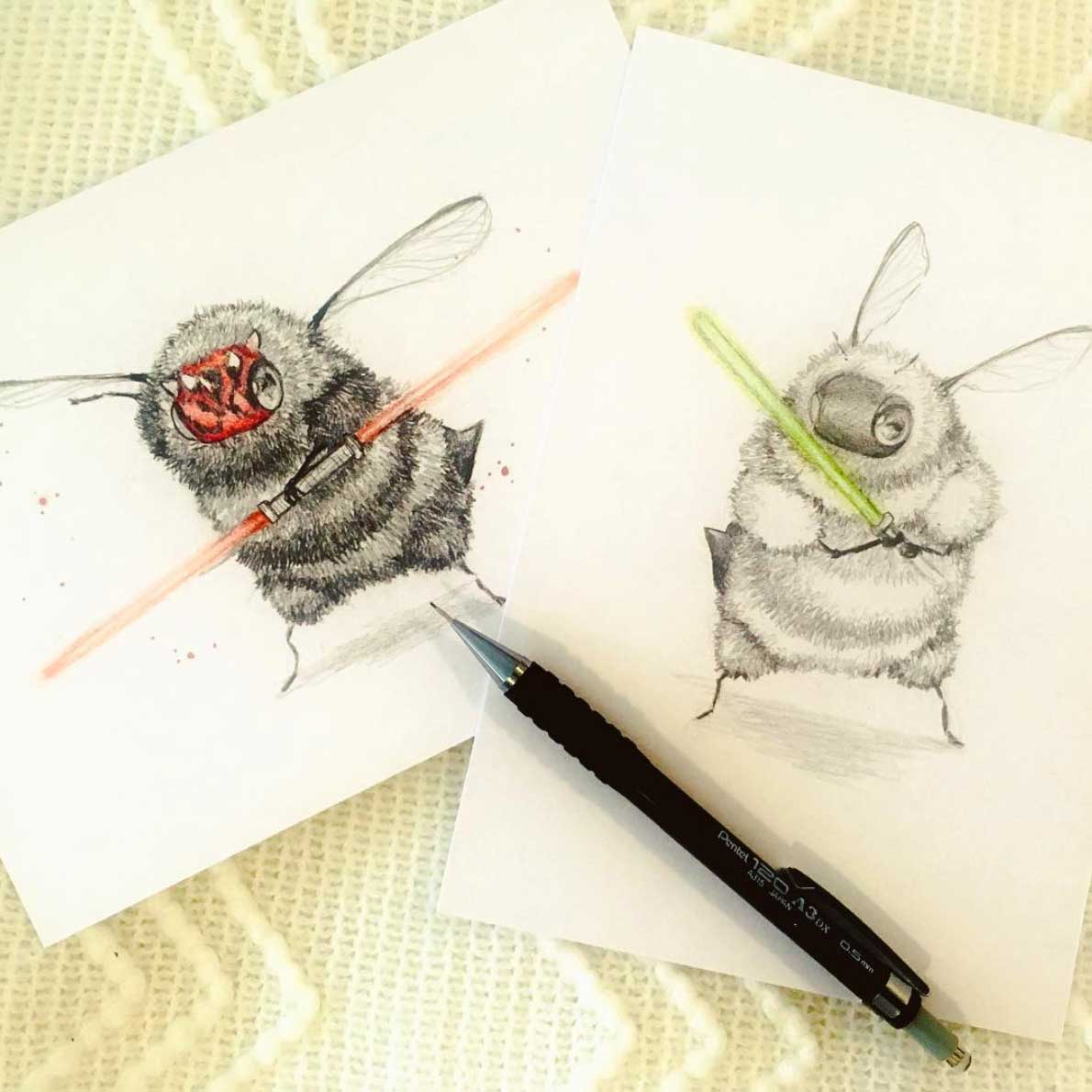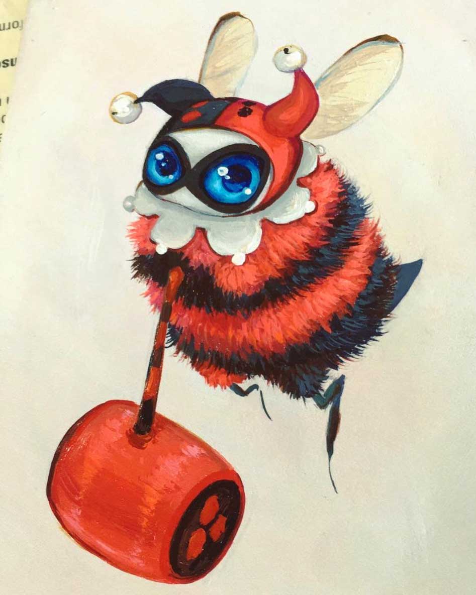 Camilla d’Errico malt gerne süße Tierchen und möchte die Biene ein bisschen mehr ins Rampenlicht rücken. Erfolgreich schafft sie das zuletzt mit einer fortlaufenden Reihe an „bienifizierten“ Popkulturfiguren. Aber neben „Beekachu“, „Bat-Bee“ und Co. sind auch die einfach nur farbig gestalteten Regenbogen-Bienen einfach nur zuckersüß geraten.