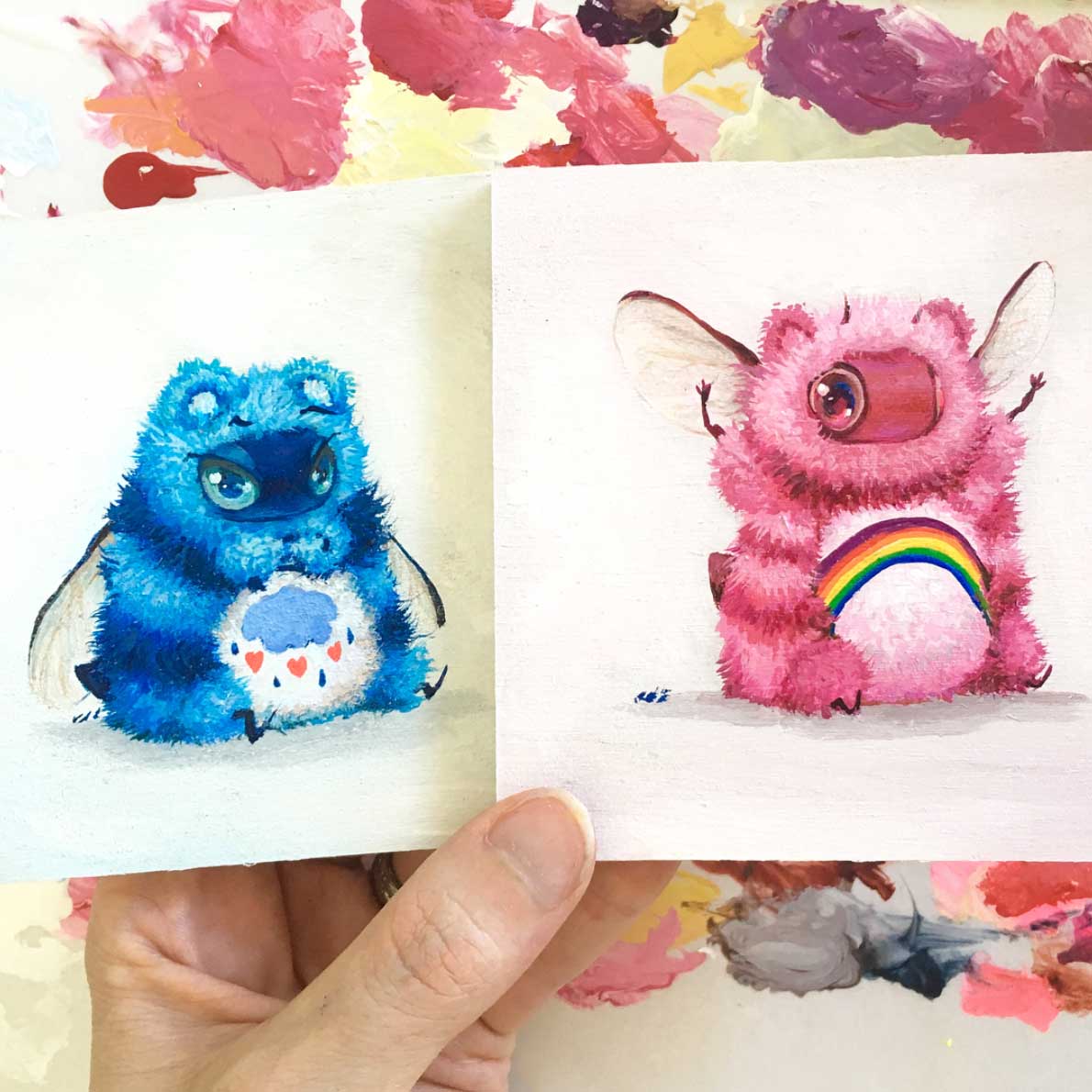„I am a hopeless romantic that loves the planet, French bulldogs, watermelons, vampires and zombie hunters! I also paint big-eyed beauties surrounded by melting rainbows and lots of animals.“
