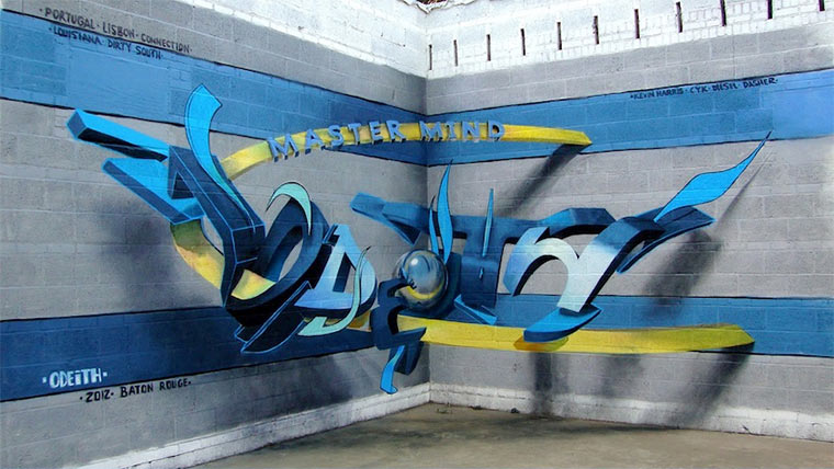 Sehr geile Pieces von Street Artist Odeith aus Portugal. Der Lissaboner schafft es eindrucksvoll, unser Auge an der Nase herumzuführen. Glaubhafte 3D-Effekte sprühen zu können, ist zwar eine Basisform des Graffitis, was er hier anstellt ist jedoch auf oberster Ebene anzuordnen. Vor allem seine vermeintlich aus Ecken heraushängenden Schriften haben es mir sehr angetan. Klasse Technik, coole Artworks!