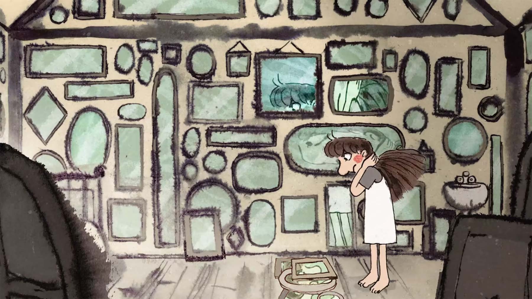 „In a little house filled with mirrors, Fiep focuses on her physical imperfections so intensely that her distorted self-image grows out of proportion… Literally.“