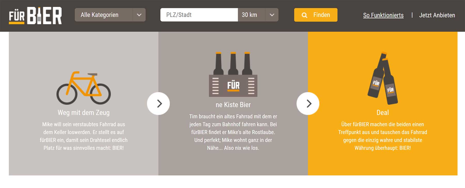 Jürgen braucht einen günstigen fahrbaren Untersatz. Auf fürBIER findet Jürgen das von Thorsten eingestellte Fahrrad und nimmt mit ihm Kontakt auf. Er bringt Thorsten eine Kiste Bier vorbei und holt sich als glücklicher neuer Fahrradbesitzer den liebgewonnen Drahtesel ab.“
