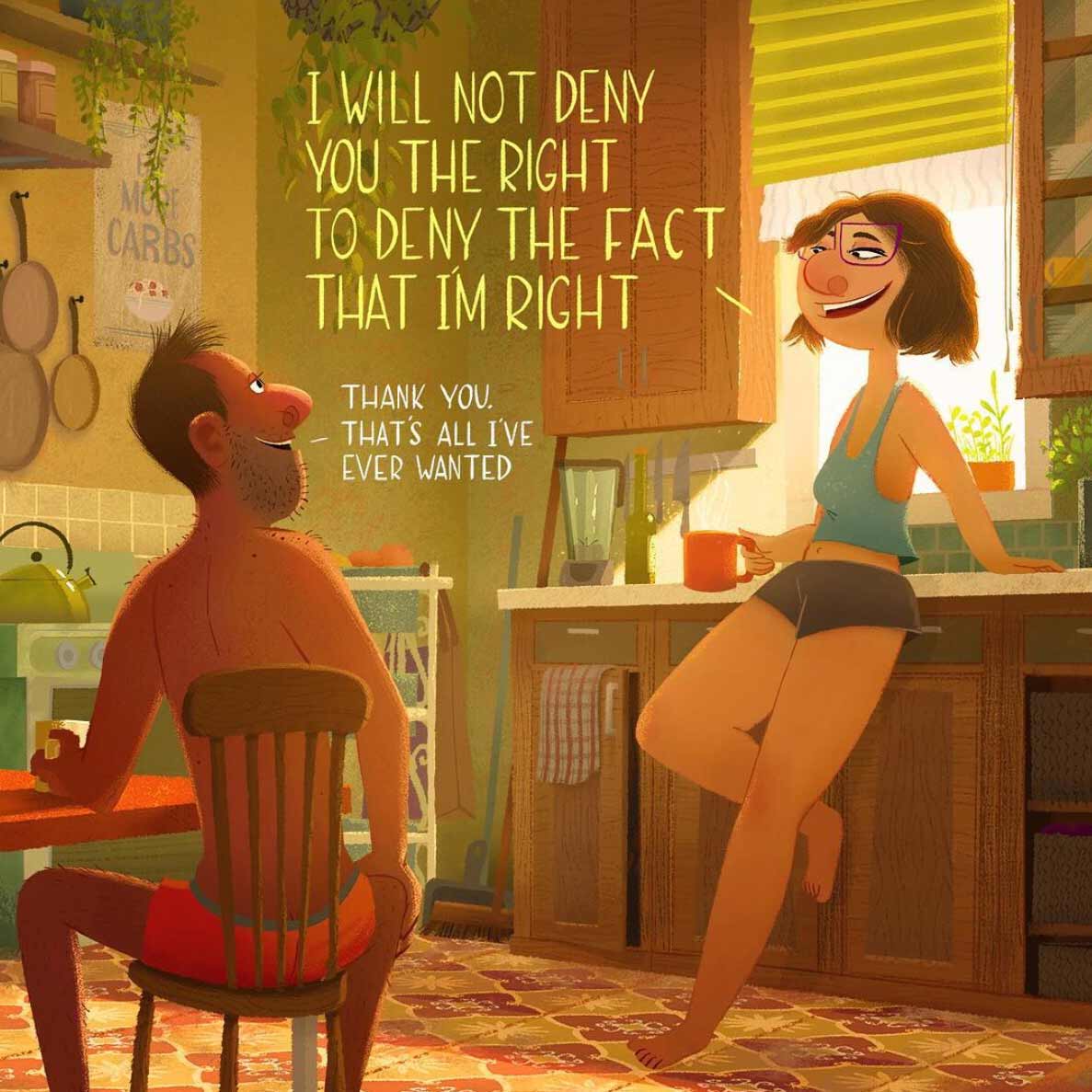 Der als Concept und Character Artist bei „Dreamworks Animation“ arbeitende Avner Gellner hat ein wundervolles Hobby: Wenn ihr irgendwo im Privatleben skurrile Gesprächsfetzen mithört, schreibt er diese auf, um sie später daheim zu illustrieren. Heraus kommen Ein-Panel-Comedy-Stücke, die das Leben geschrieben hat. Herrlich! Da findet man dann auch die ein oder andere gesellschaftliche Eigenheit unserer Zeit wieder…