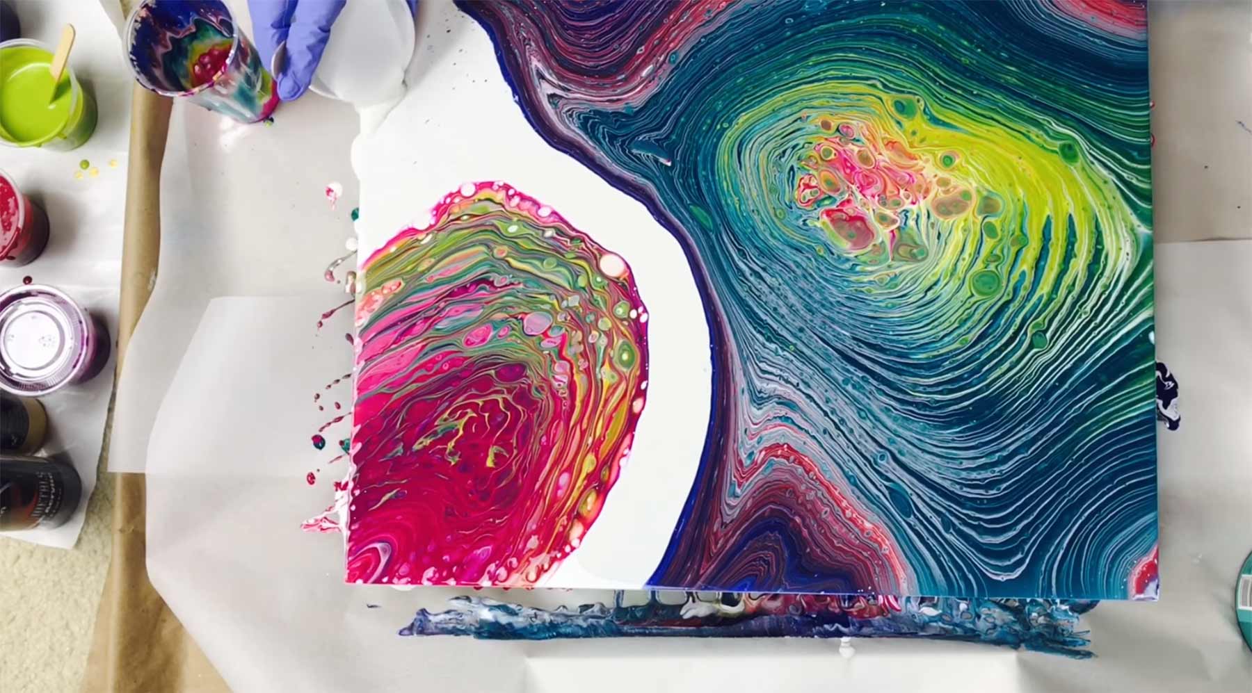 Nicky James Burch erstellt wundervoll farbenfreudige und verschwommene Gemälde, indem sie Becher mit Acrylfarbe-Schichten füllt und dann ausschüttet. Heraus kommen surreale Muster, die an Batik-Mechaniken erinnern. Schöner als die fertigen Motive finde ich aber die Videos, in denen wir die angewandte „Dirty Swirl“-Technik zu sehen bekommen. Hat was Entspannendes…