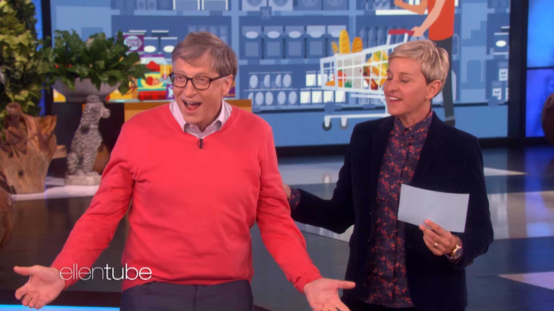 „Ellen tested Microsoft mogul Bill Gates‘ knowledge of grocery store prices with a game of ‚Bill’s Grocery Bills‘.“