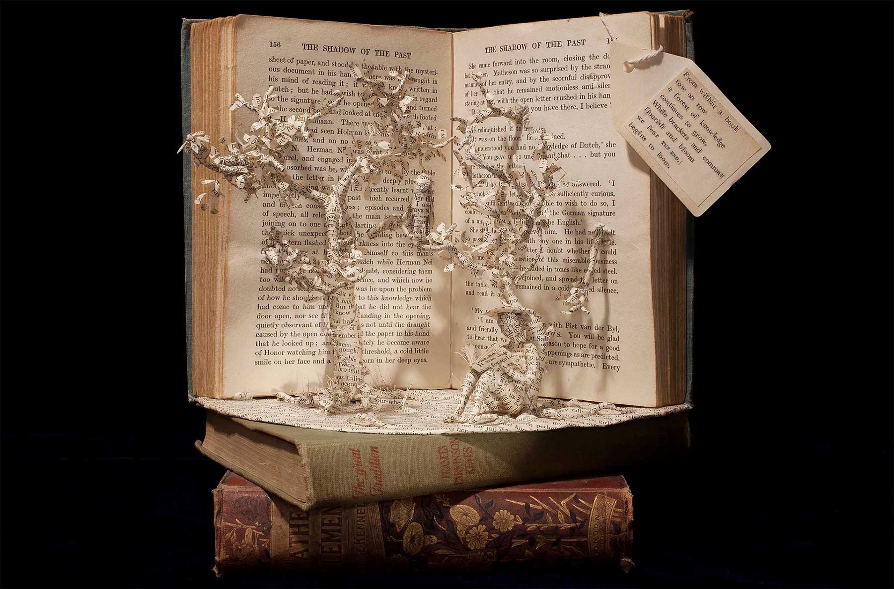 „Book sculpture is my creative outlet to highlight an appreciation of the little things in life. A good book, a beautiful tree, a flower in full bloom. With my scissors, glue and paper, and led by the title of the books I chance upon in antique and charity shops, I am able to recreate plants, animals, architecture and literary scenes with all the details I love on a manageable scale.“ (Artist Statement)