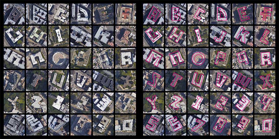 „Here our new typo-graphic project based on the study of a particular class of font. Analyzing google maps, we realized that every city possesses its own font. Hidden in plain sight. A unique and special font linked directly to the territory, directly to the city, to the buildings. All you need is to take a look from the sky.“