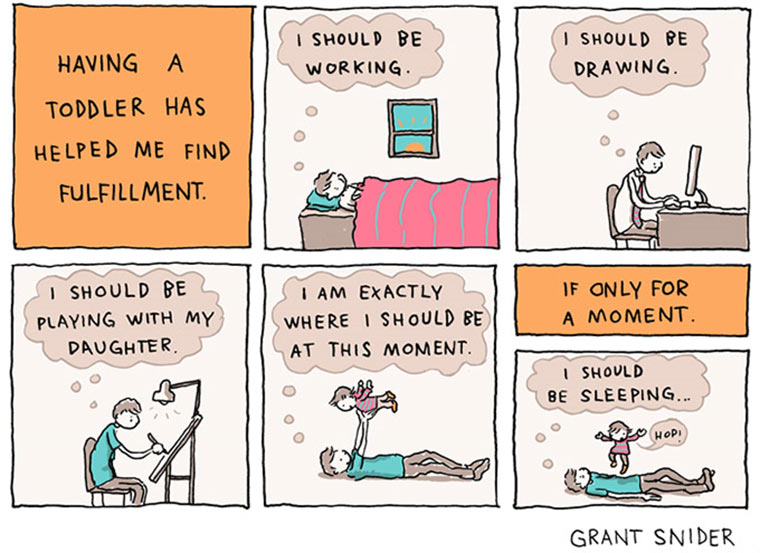 Da fühlt man richtig mit! Und ist unterhalten. Comic-Zeichner Grant Snider hat ein 18 Monate altes Kleinkind daheim. Zum vergangenen Vatertag hat er bei Incidental Comics diese Panels online gestellt, die die kleinen Herausforderungen des Vaterseins eines Kleinkindes illustrieren. Sehr charmant inszeniert und selbst als Nicht-Vater kann man da vieles nachvollziehen.