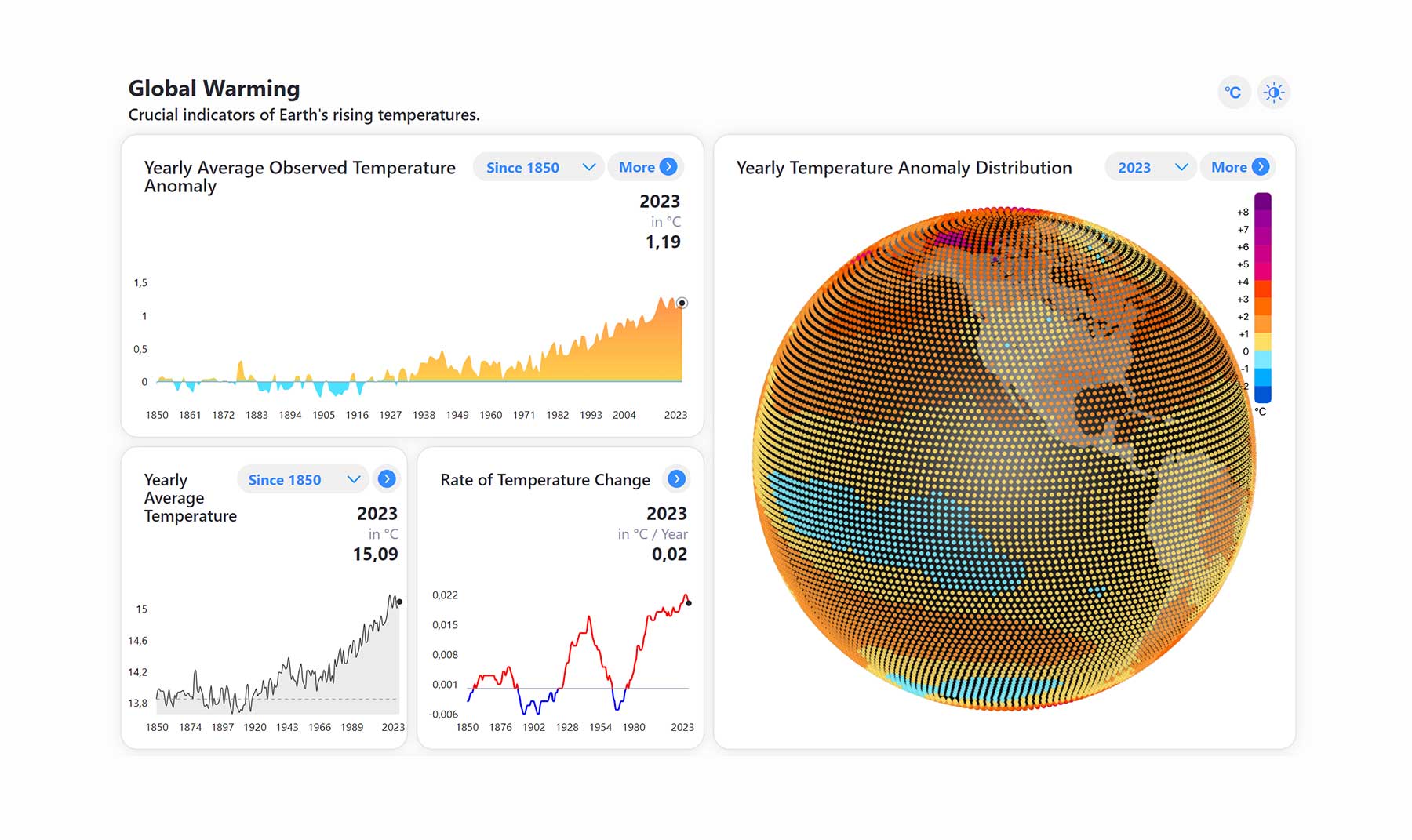 Die wissenschaftlich aufbereiteten Daten sind dabei in fünf verschiedenen Dashboards abrufbar: „Indikatoren des globalen Klimawandels“, „Globale Erwärmung“, „CO2-Verbrauch“, „Methan-Ausstoß“ sowie „Distickstoffmonoxid-Verbreitung“. Dabei sind viele der angezeigten Diagramme interaktiv anpassbar, so dass man neben Darkmode oder Temperatur-Anzeigemodus auch den Jahreswert auswählen kann. Einige sind sogar in externen Seiten einbettbar, wie dieses hier, das den Anstieg der jährlichen Durchschnittstemperatur-Abweichung aufzeigt: