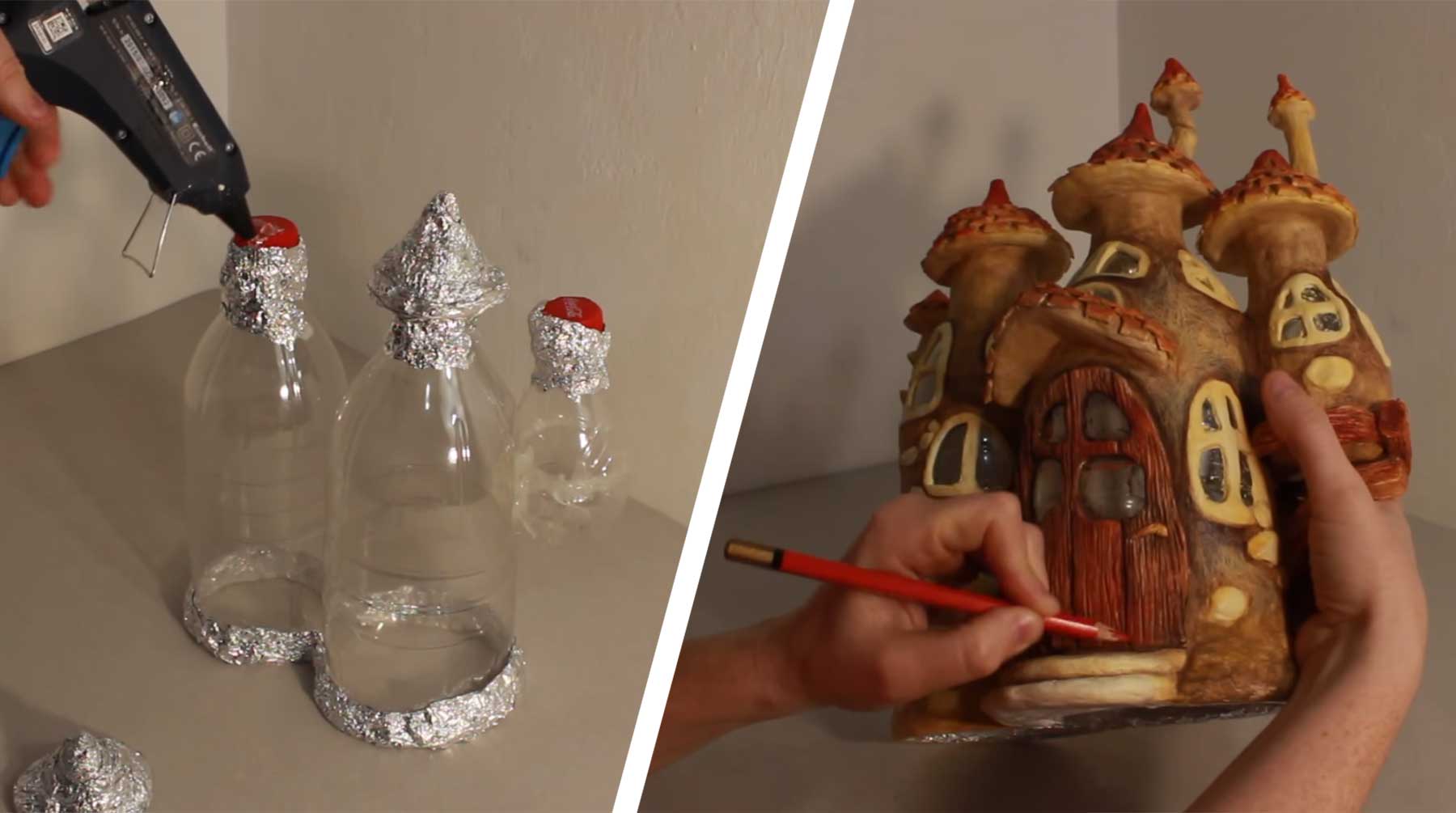 Ein paar Plastikflaschen als Basis, Alufolie, Lehm, viel Heißkleber und noch mehr Geduld – fertig ist die Feen-Immobilie! YouTuberin Creative Mom lässt uns daran teilhaben, wie sie aus alten Recyclingflaschen in bester Upcycling-Manier tolle kleine Lampen und Deko-Häuser bastelt.