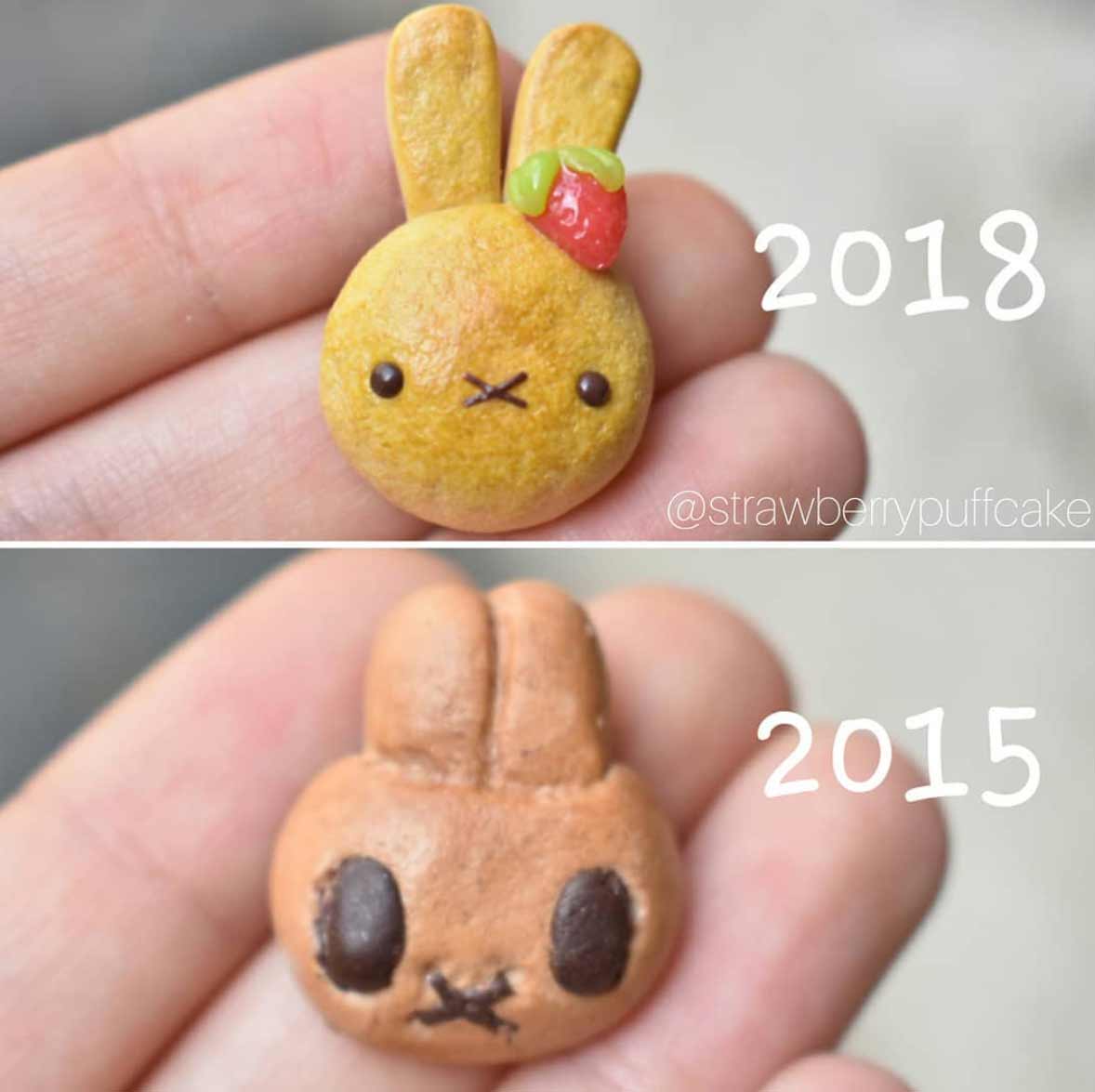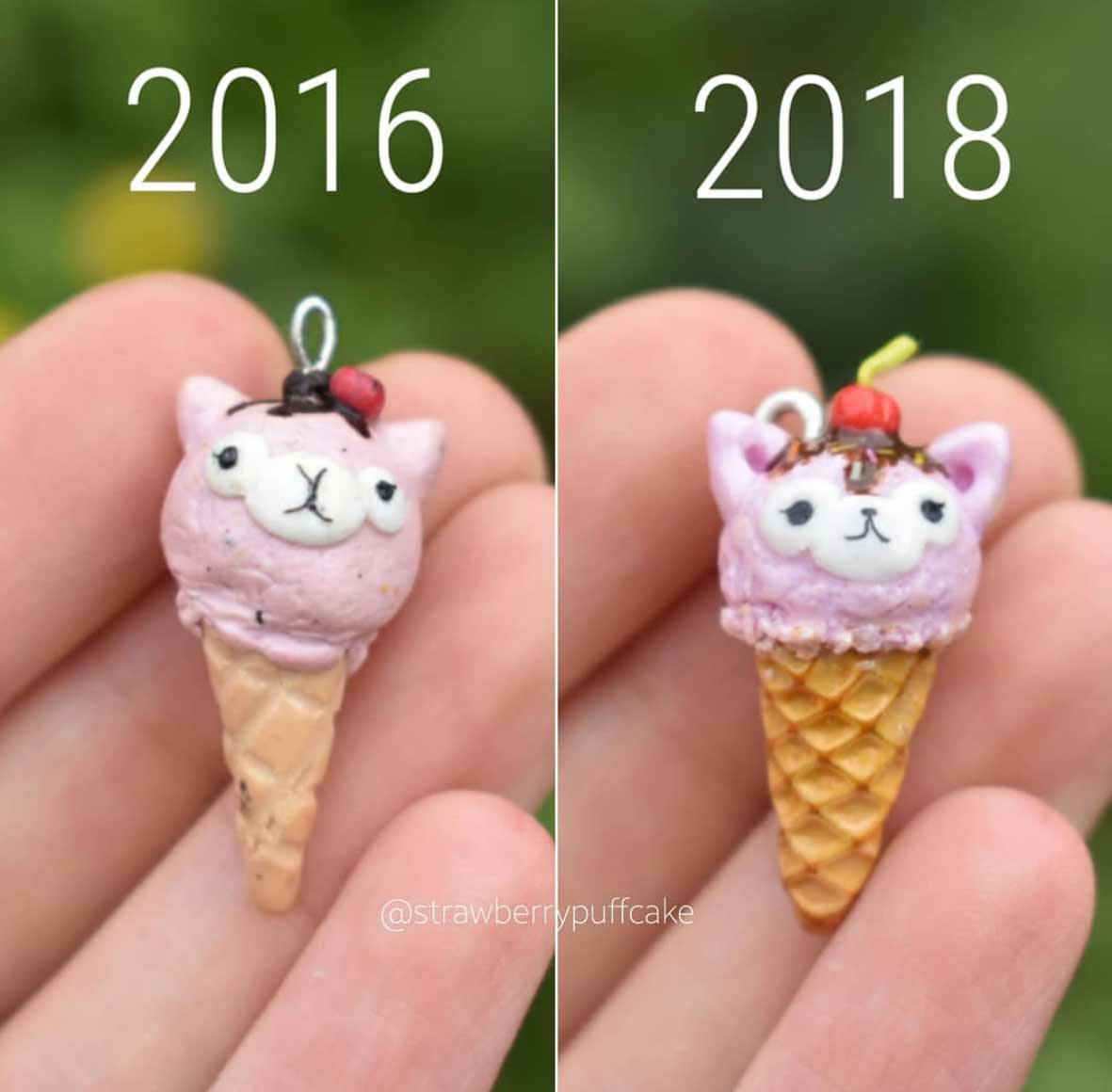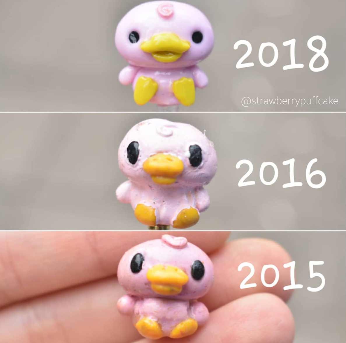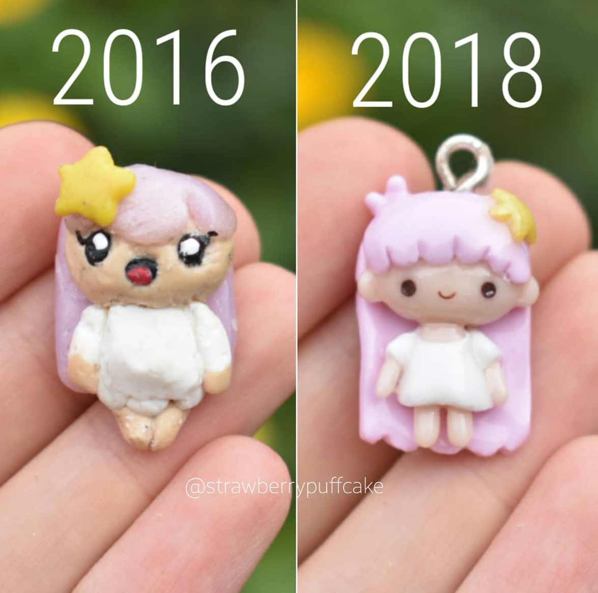 Die Künstlerin erstellt seit einigen Jahren kleine Miniatur-Objekte aus Polymer. Vor Kurzem hat sie damit begonnen, ältere Arbeiten mit ähnlichen neuen Arbeiten zu vergleichen. Dabei bekommen wir eindrucksvoll zu sehen, dass sie sich vor allem in den letzten zwei Jahren enorm verbessert hat. Die Figuren sind deutlich glatter und sauberer ausgearbeitet, bieten mehr Details und ganz nebenbei scheint auch ihr Fotodokumentations-Game ein, zwei Level gestiegen zu sein. Sehr schön!