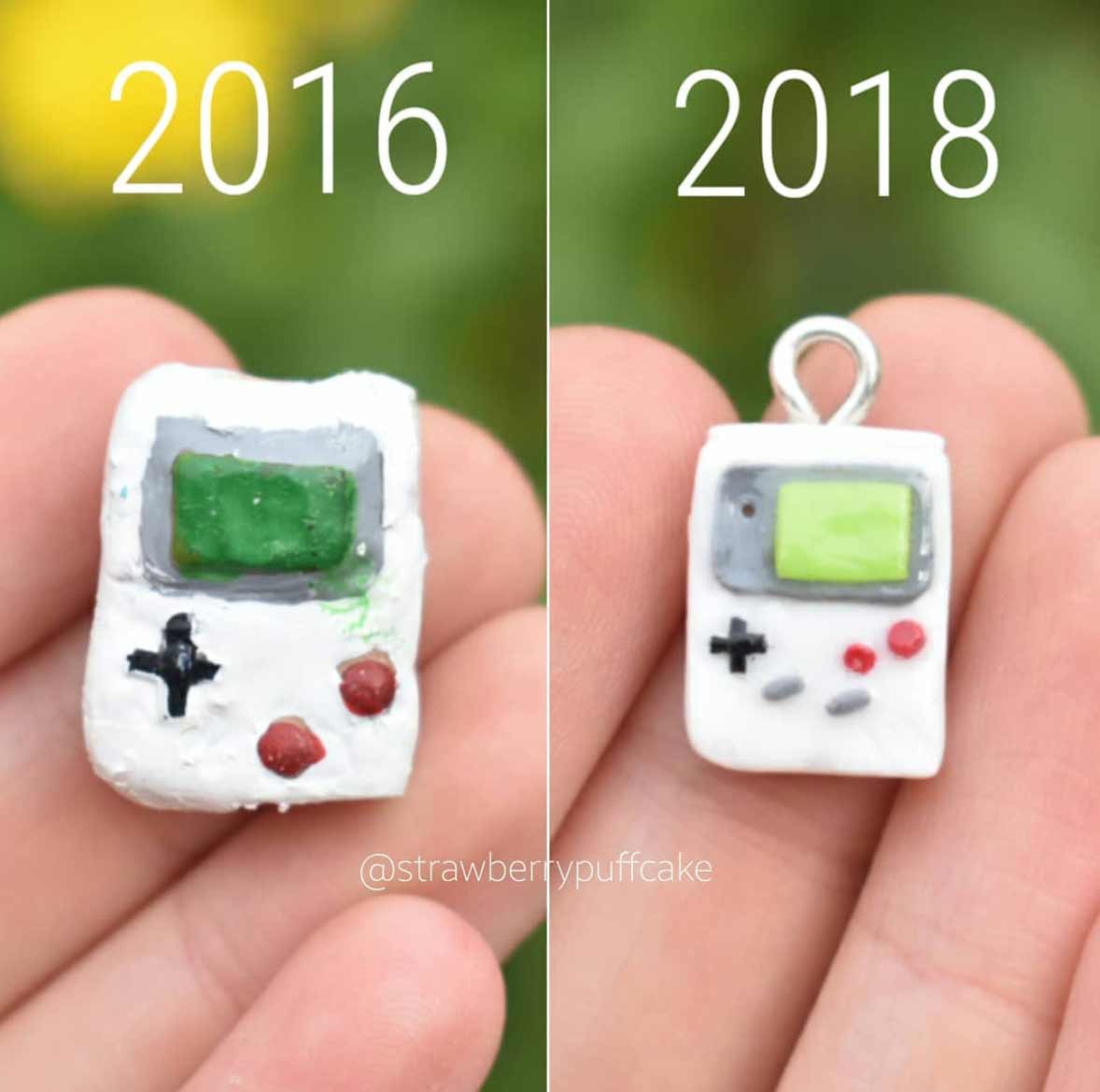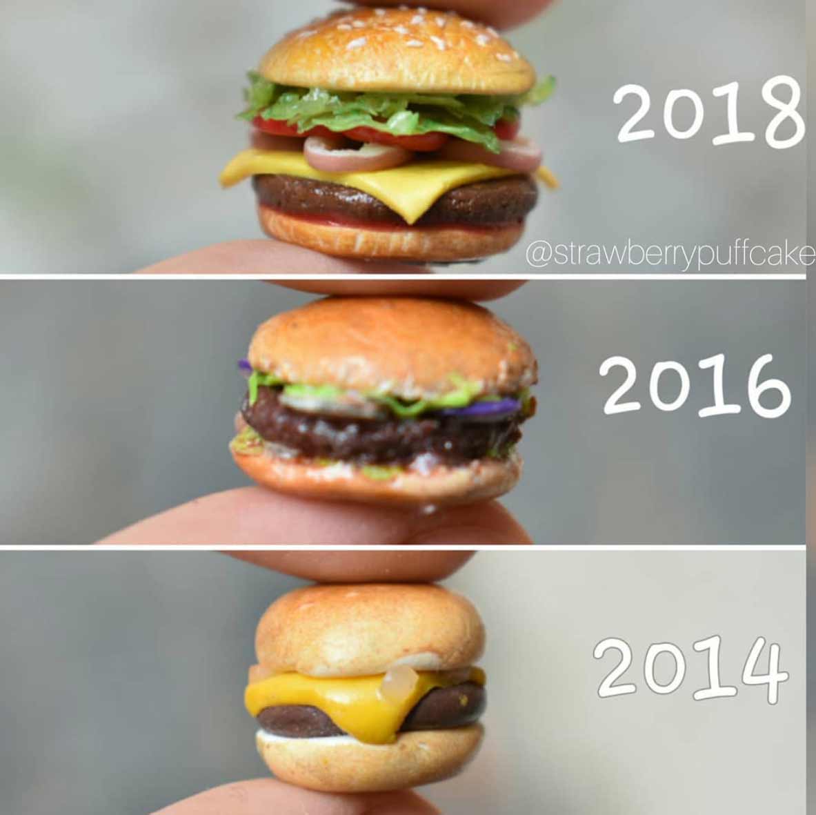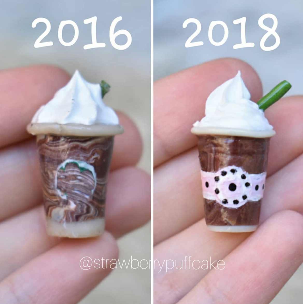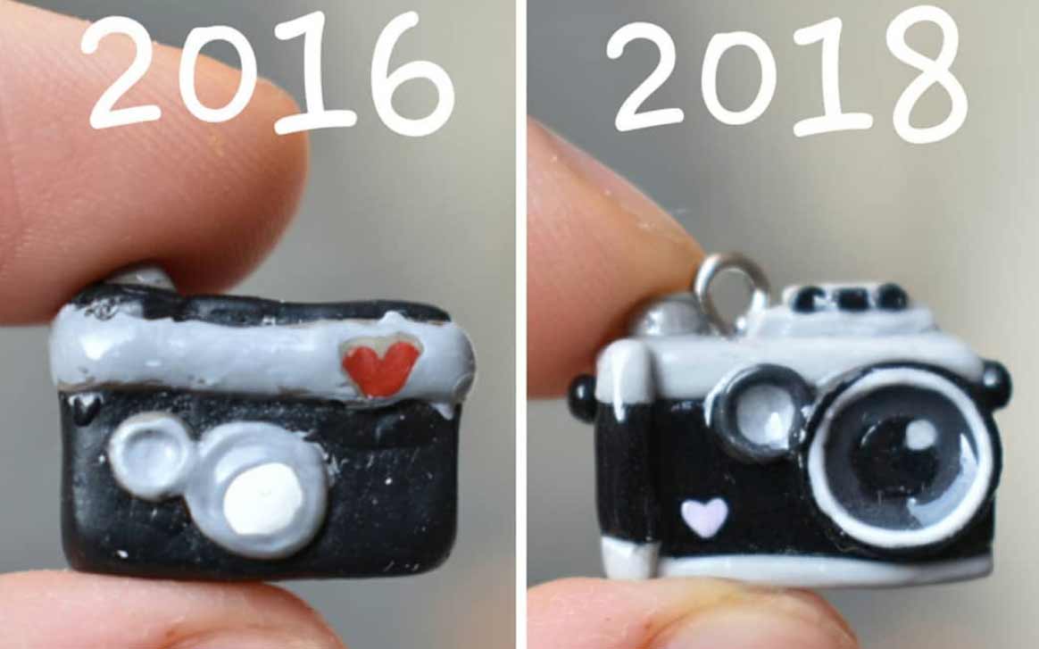 Die Künstlerin erstellt seit einigen Jahren kleine Miniatur-Objekte aus Polymer. Vor Kurzem hat sie damit begonnen, ältere Arbeiten mit ähnlichen neuen Arbeiten zu vergleichen. Dabei bekommen wir eindrucksvoll zu sehen, dass sie sich vor allem in den letzten zwei Jahren enorm verbessert hat. Die Figuren sind deutlich glatter und sauberer ausgearbeitet, bieten mehr Details und ganz nebenbei scheint auch ihr Fotodokumentations-Game ein, zwei Level gestiegen zu sein. Sehr schön!