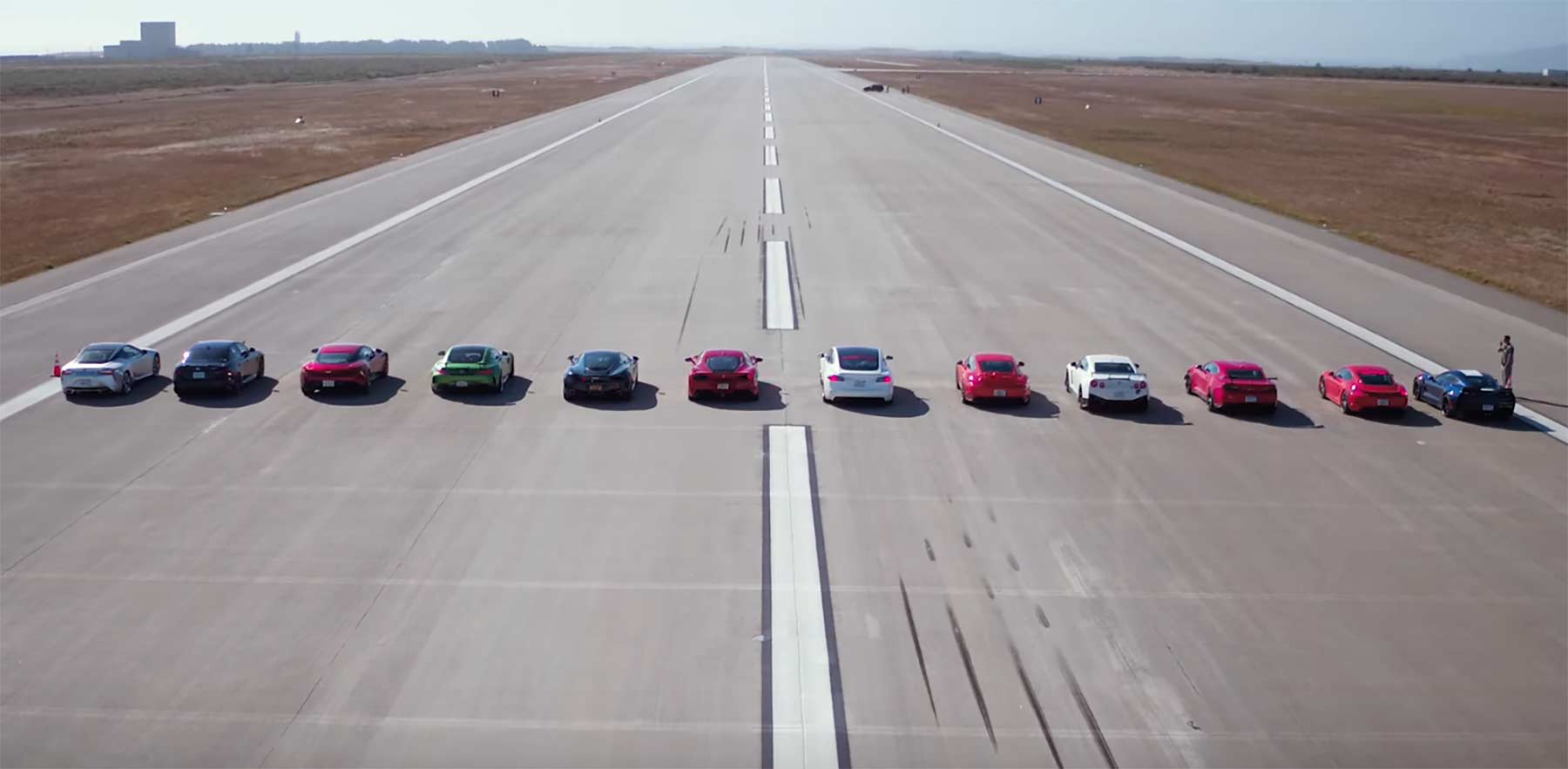 „We have the Alfa Romeo Giulia, Aston Martin DB11, Chevrolet Camaro ZL1 1LE, Chevrolet Corvette Grand Sport, Ferrari 488 GTB, Lexus LC500, McLaren 570GT Mercedes Benz AMG GTR, Nissan GT-R Nismo, Porsche 718 Cayman S, Porsche 911 Turbo S, Tesla Model S P100D– all gathered together on an 15,000 ft airstrip at Vandenberg AFB to find out which car is the fastest. Obviously these 12 competitors display a wide range of power and performance, so why do we continue lining them up for one, over-the-top drag race?… Because We Can!“