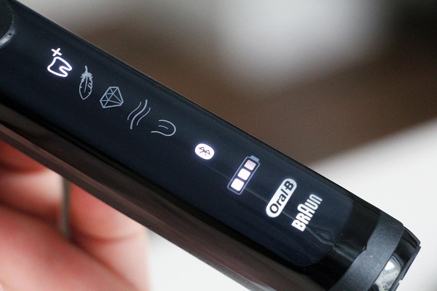 Auch gefällt mir, dass man nun den gewählten bzw. aktiven Putz-Modus direkt per Leuchtsymbol angezeigt bekommt (zuvor musste man sich „blind“ durch die Modi schalten, wenn nicht gerade die Digital-Anzeige in der Nähe war).