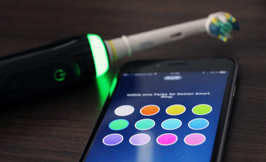 Spätestens bei der Einrichtung der Oral-B GENIUS 9000 über Bluetooth in der Oral-B App fällt einem auch der so genannte SmartRing auf. Eine Leuchtleiste, die das Handstück am Ende des Bürstenaufsatzes umgibt und die Funktion der Signalleuchte übernimmt (z.B. bei zu festem Druck). Zwar recht überflüssig, aber für Design-Personalisierbarkeits-Fans wie mir eine schöne Sache: Man kann „seine“ Farbe individuell einstellen. Zwar nur durch vorgegebene Farbtöne, ohne RGB-Mixer, aber nette Sache.