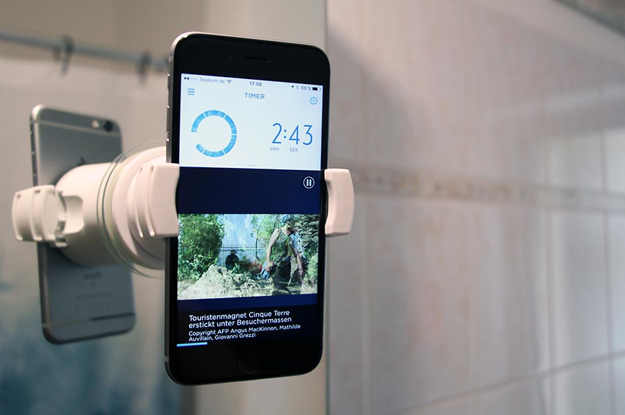 Dafür hat die Spiegelhalterung mich doch wieder etwas mehr zur App gebracht. Denn während der Putzzeit werden einem ausgewählte und individualisierbare News und Videos im jetzt auf wunderbarer Augenhöhe positionierten Display angezeigt. Perfekt für die „toten drei Minuten“, die man morgens und abends gelangweilt vor dem Spiegel verbringt.