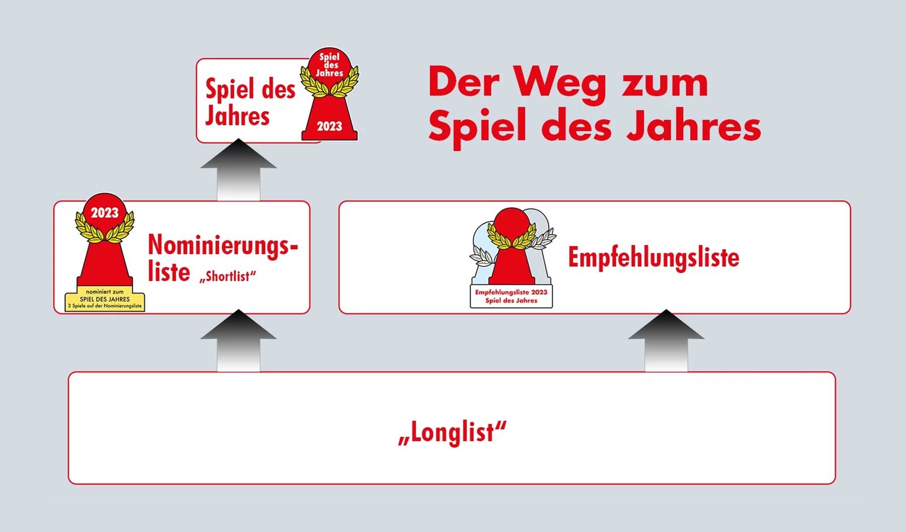 Wie ihr merkt, gibt es noch nicht DAS Spiel des Jahres. Das liegt am Ablauf der Ehrung. Die Shortlists und Nominierungen sind jetzt raus, die finale Bekanntgabe der Preisträger wird im Juli stattfinden. Genauer gesagt am Sonntag, den16. Juli 2023, ab 18 Uhr in der nhow Music Hall in Berlin. Dann wissen wir Bescheid, welche Spiele von den jeweils drei Nominierungen Spiel, Kennerspiel und Kinderspiel des Jahres 2023 sein werden.