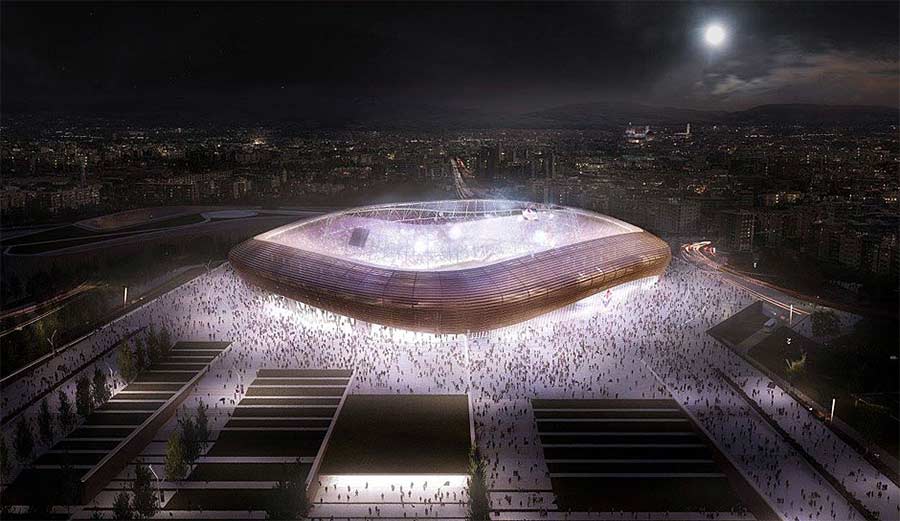 Die leuchtende Nachtansicht des neuen Florentina-Stadions könnt ihr ganz oben im Beitrag bestaunen. Interessant ist aber der angedachte VIP-Blick auf Spielfeldhöhe – als wäre man direkt an der Seitenlinie. Nett.