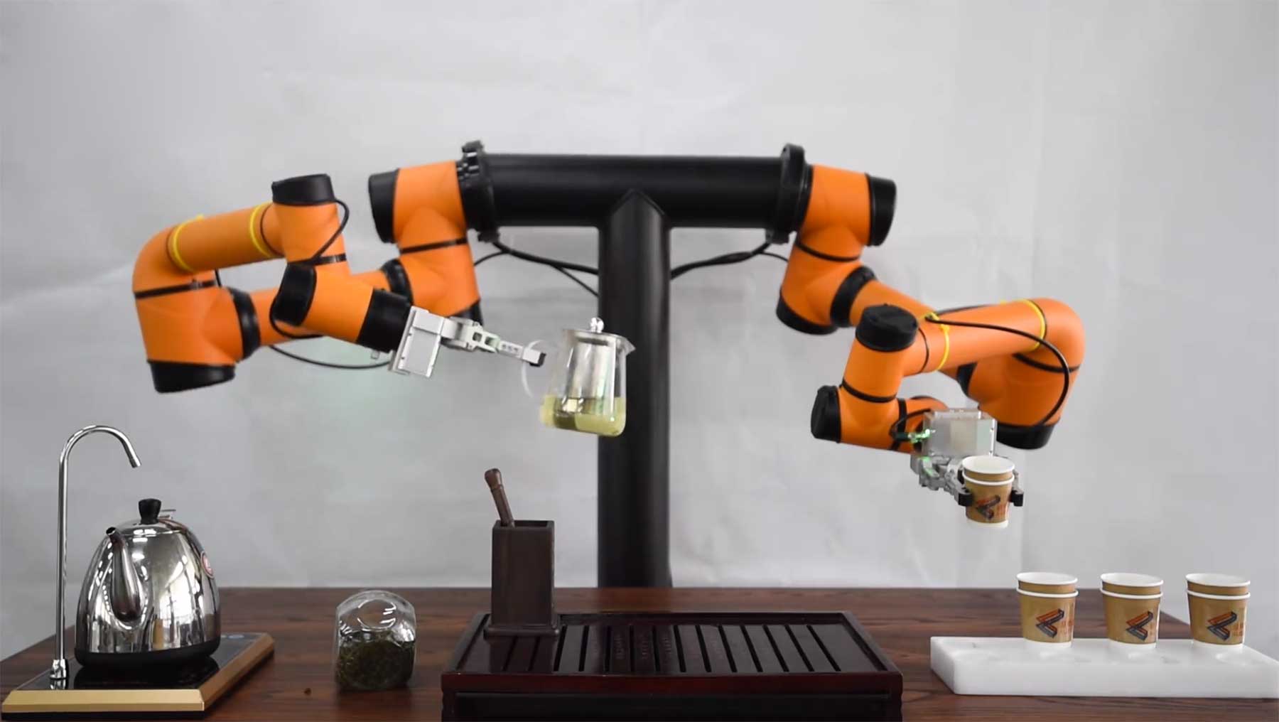Kaffeekochen wird ja immer als ach so große Kunst dargestellt, dabei kann das mittlerweile jede 5 Euro-Maschine (bewusst übertrieben bis falsch dargestellt). Aber Teekochen, DAS ist das wahre Handwerk der Heißgetränke-Enthusiasten! Oder zumindest derer, die – wie ich – keinen Kaffee mögen. Da muss man nicht nur die richtigen Kräuter und Inhaltsstoffe mühsam per Hand im Wald auflesen, waschen, schneiden und trocknen, nein, man muss auch Wasser kochen, die Dinge miteinander verbinden und vor allem – und das ist die absolut hohe Meisterkunst – nicht vergessen, den Beutel rechtzeitig herauszunehmen. Wie angenehm wäre es da, wenn ein Roboter all diese kleinen Arbeitsschritte für einen übernehmen könnte?! Der „AUBO i5 Dual-Arm Robot“ kann das. Und kostet bestimmt auch höchstens 4,99 Euro…