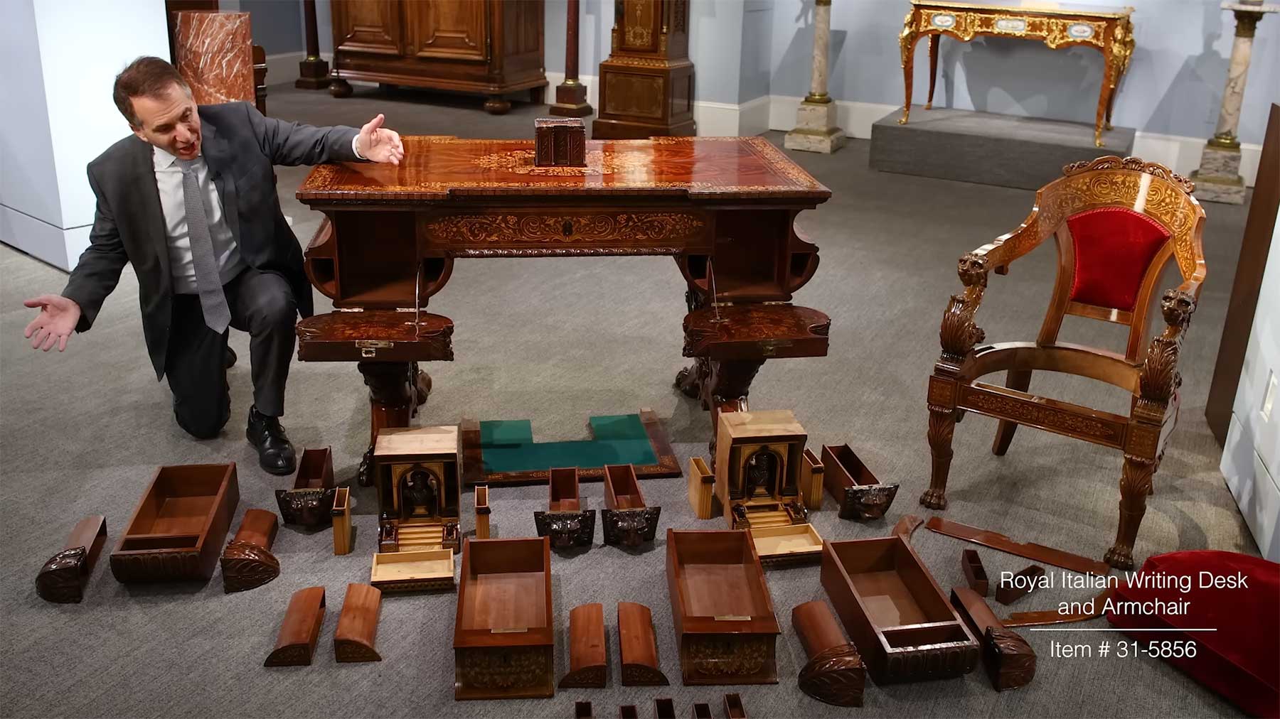 Alte Massivholzmöbel sehen teilweise auch so massiv aus, weil massiv viel Stauraum für Krams integriert ist. So wie bei diesem aus dem Jahre 1840(!) stammenden Antiquariat, das gar nicht mehr aufhören möchte, Geheimfächer entdecken zu lassen. Okay, der Stuhl gehört auch zur Schreibtisch-Kombi, aber das ist schon Next-Level. Da kann man schon mal schnell vergessen, wo man das Weihnachtsgeschenk für XY verstaut hatte…