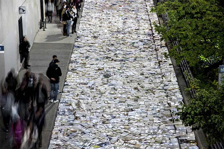 Jedenfalls hat das spanische Künstler-Kollektiv Luzinterruptus einfach mal 10.000 Bücher in den Straßen Torontos ausgebreitet. „Literature vs. Traffic“ hat im Rahmen des Nuit Blanche-Kunstfestivals für ordentlich Aufsehen und Verkehrsberuhigung gesorgt. Und mit Lichtern wurde das Fluss-Erlebnis noch gekonnt intensiviert.