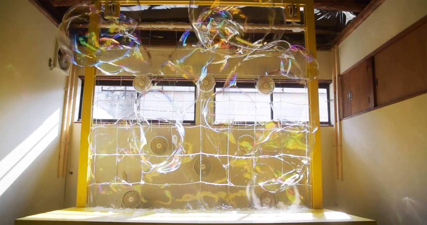 Zunächst mal möchte ich im Zuge dieses Beitrages darauf hinweisen, welch hochkulturellen Dachzeilen ich stets für euch aus dem Nichts erschaffe. Beinahe ebenso künstlerisch wertvoll ist diese „Projection Wall“ von Rintaro Hara. Die hat zwar überhaupt nichts mit Projektionen zu tun und eine Wand ist sie auch eher so semi, aber dafür pusten eine Hand voll Ventilatoren nach manuellem Aufzug eines beseiften Netzes ganz viele ganz große Blasen. Und das mag ich.