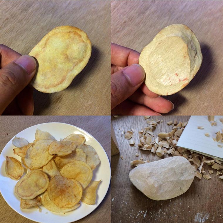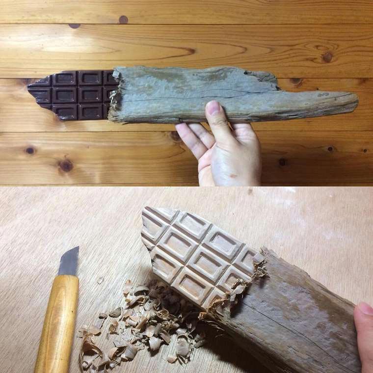 Na, Appetit auf Crossain bekommen? Da seid ihr dem Seiji Kawasaki aber gehörig auf den Holzleim gegangen. Der japanische Künstler schnitzt sich sein Essen selbst. Aus Holz, am Stück und mit überzeugend realistischer Bemalung. Vor allem die filigranen Umsetzungen wie Schokoriegel, Nüsschenmix oder Chips haben es mir angetan. Und jetzt habe ich tatsächlich auch etwas Hunger bekommen, obwohl ich um die Künstlichkeit der Gebilde Bescheid weiß – SO GUT sind die gemacht!