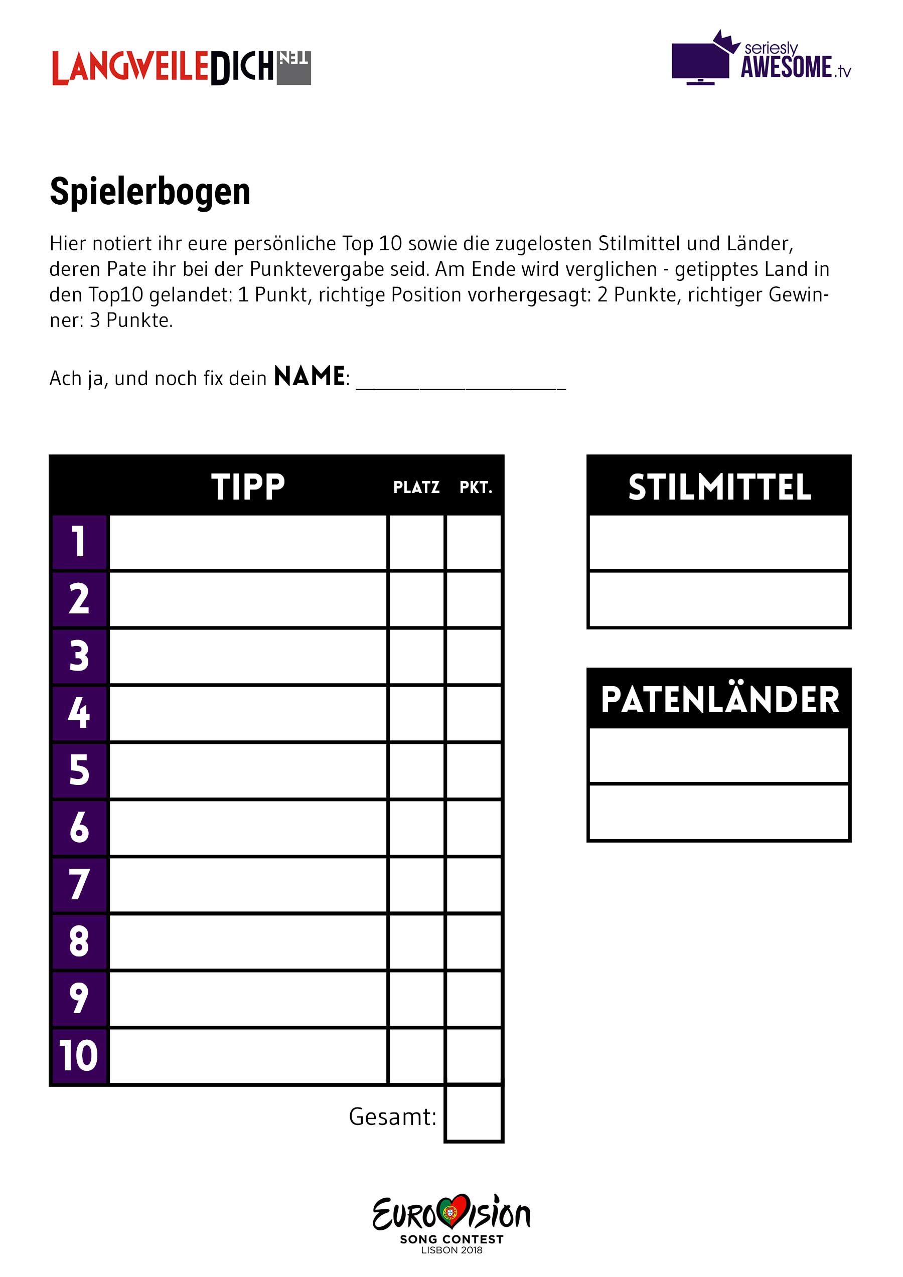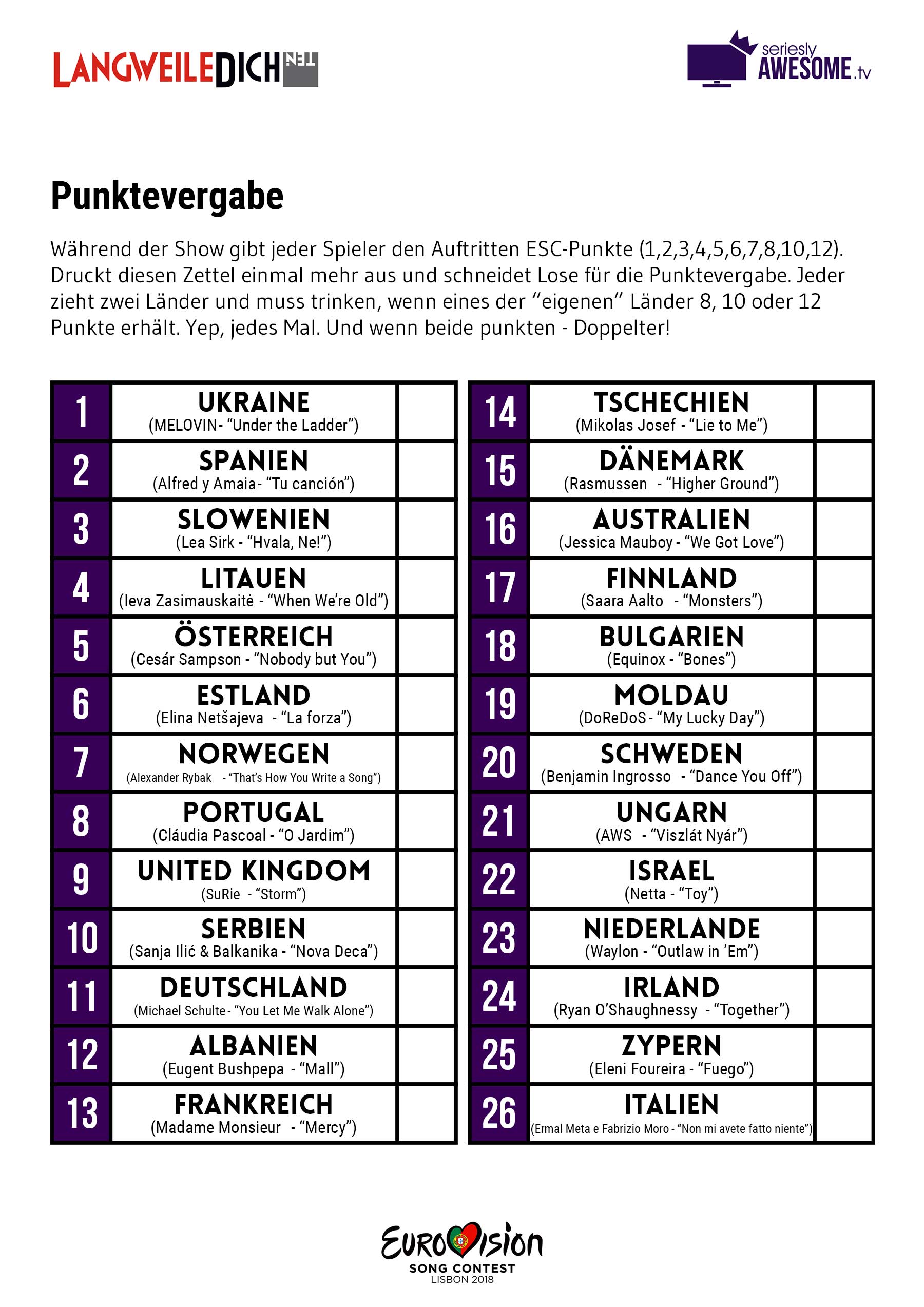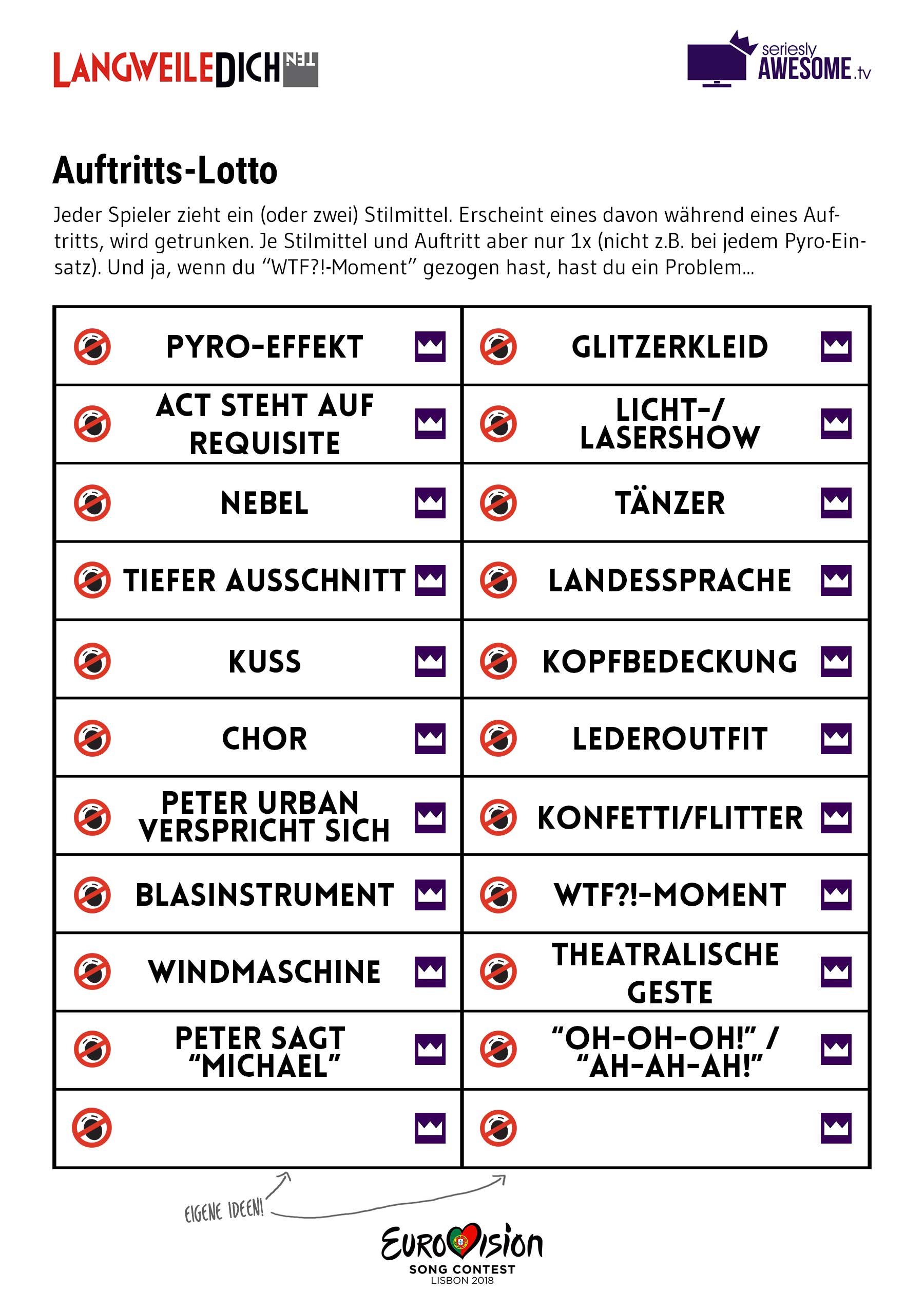 Dieses Jahr haben wir bis auf die teilnehmenden Länder (duh!) und einer kleinen Justierung der Auftritts-Lotto-Elemente eigentlich nichts geändert. Wer also schon einmal mitgemacht hat, braucht sich gar nichts mehr durchlesen – einfach herunterladen, ausdrucken und ab geht die Luzi!