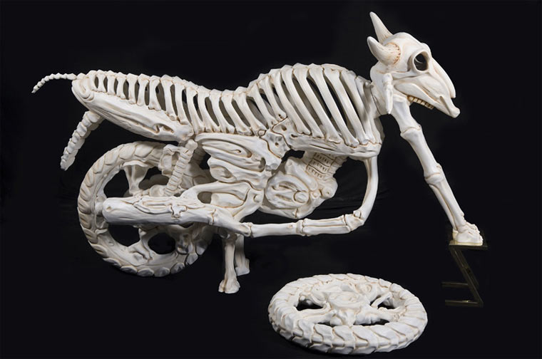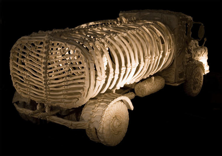 Groteske Arbeiten von Künstler Jitish Kallat. Der baut gerne riesige Autos, LKWs oder Motorrädern aus Knochen. Sind natürlich keine (zum Glück!), sondern passend gefertigte und bemalte Stahlelemente. Heraus kommen aber skurrile knöcherne Fahrzeuge, die in jedem Horrorfilm eine Hauptrolle erhalten würden.