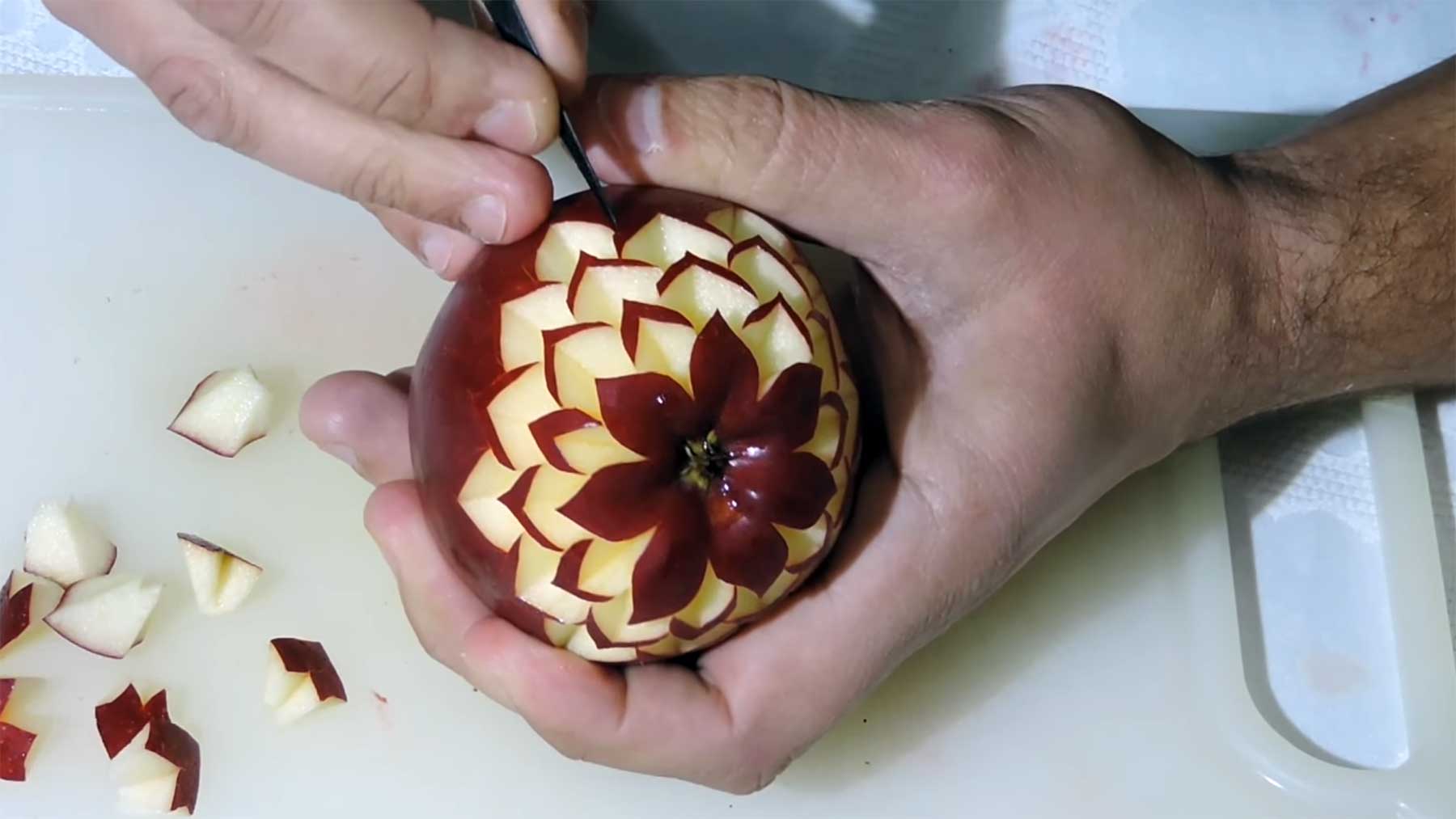 „Art in apple, see how to carve a beautiful apple flower.“