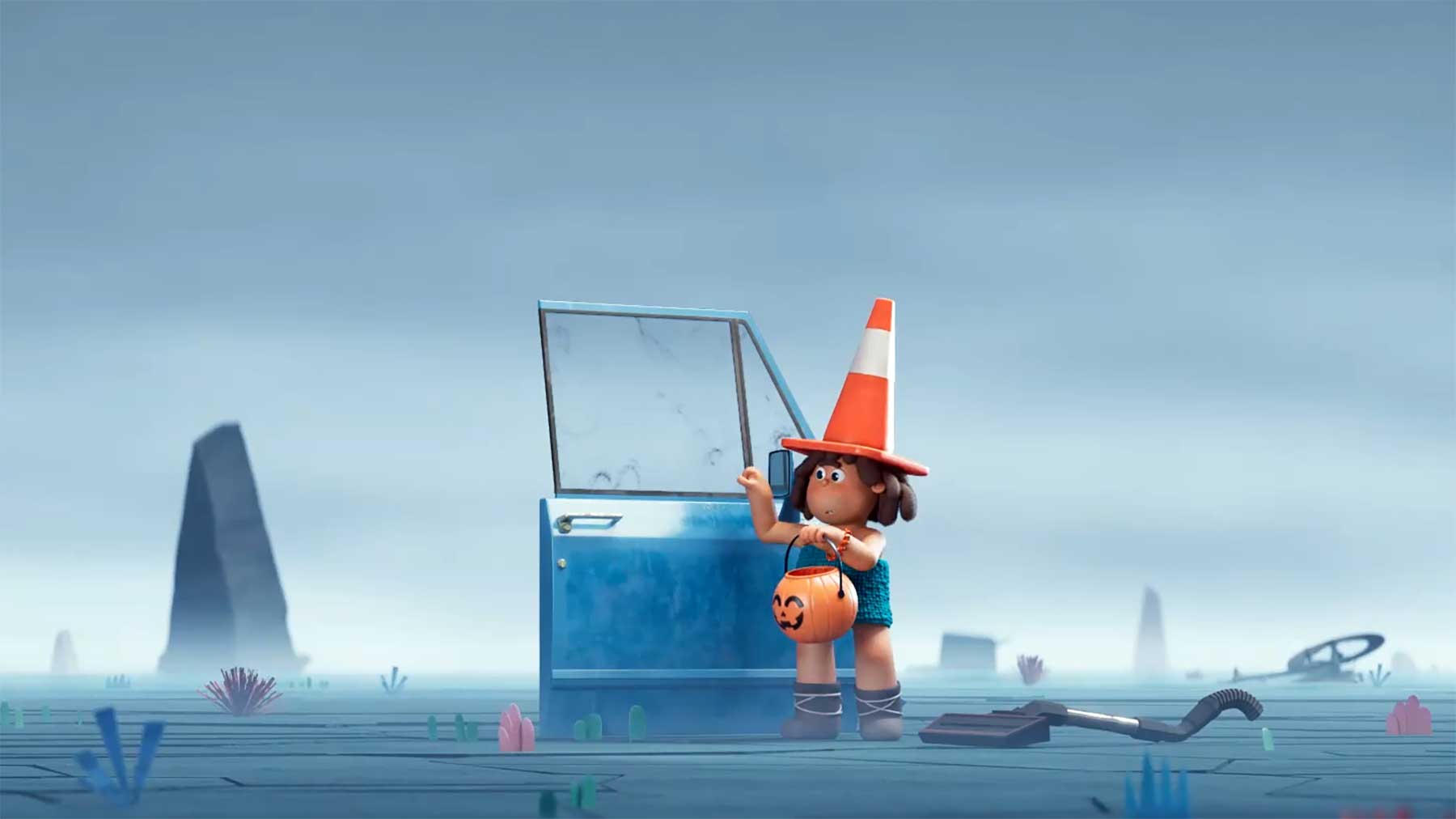 Das ist schon eine skurrile Welt, die Maryka Laudet und Quentin Camus uns da mit „Back To Cave One“ zeichnen. Alles sieht nach prähistorischer Steinzeit aus, aber eigentlich befinden wir uns in der Zukunft. Alles an erhabener Zivilisation hat sich aufgelöst – nur Plastik natürlich noch nicht. So wie ein Halloween-Kürbis-Eimer, der an eine lang vergessene Tradition erinnert…