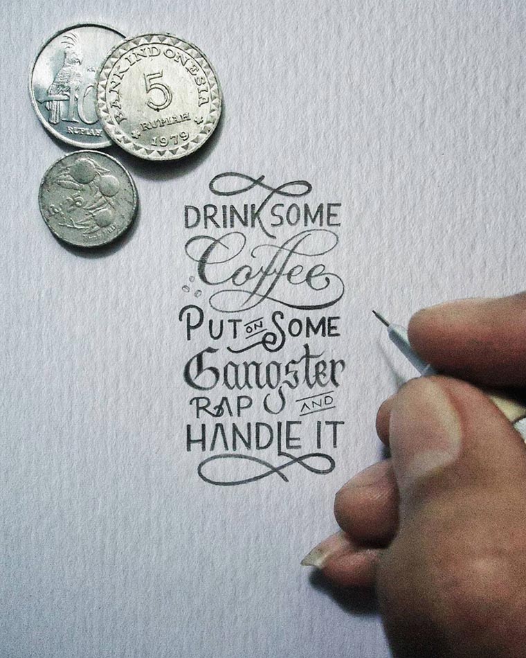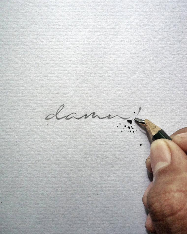 Eigentlich bin ich kein Freunde dieser Pseudo-philosophischen Lebensweisheiten, die in möglichst geschwungen-kreativer Form aufgeschrieben werden. Aber bei Dexa Muamar mache ich eine kleine Ausnahme. Seine mit Bleistift geschrieben-zeichneten Sprüche sind nämlich beinahe winzig und schauen doch super aus.