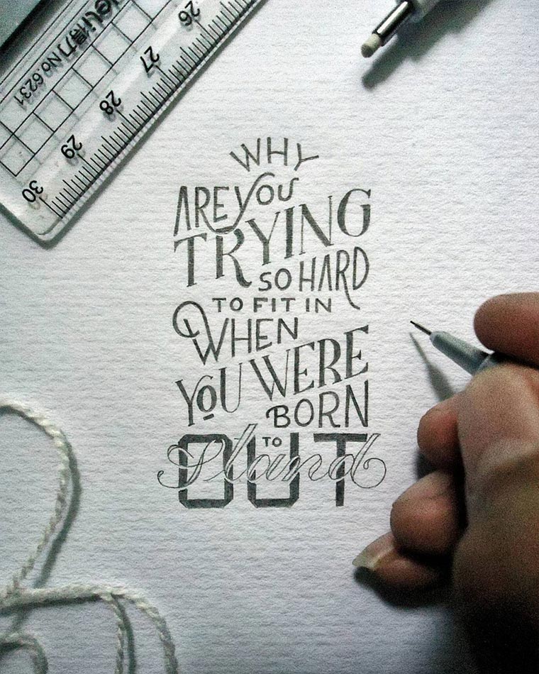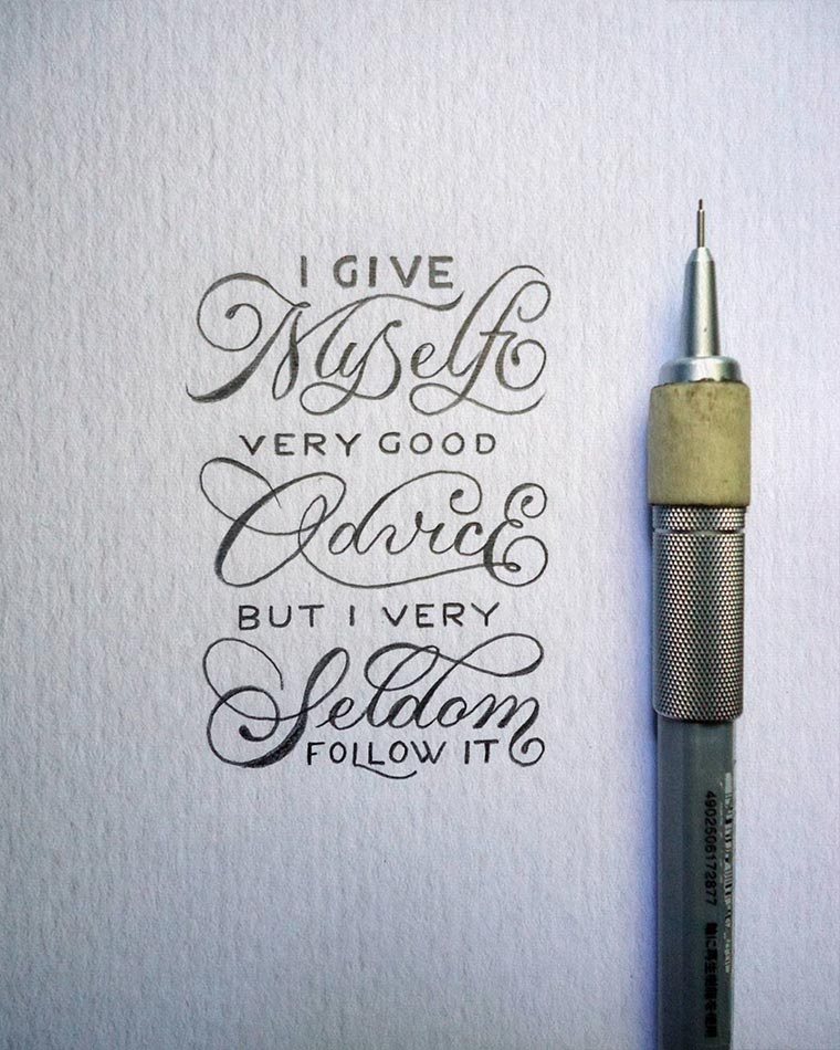 „I don’t really feel I have that ‚unique‘ style, but I’m in love with script and flourishes since actually I began with copperplate calligraphy at first. The way the letters connect are something special for me, and I can play with the flourish of course. And for now I feel more comfortable drawing at small scale. [It’s] usually at 3-4cm in width.“