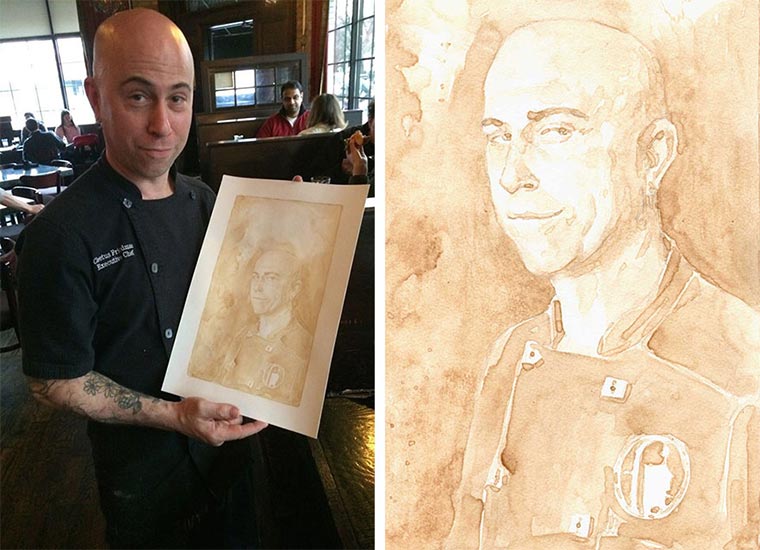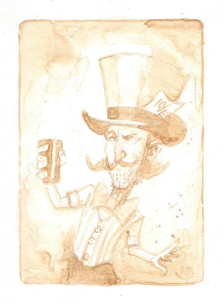 Nach den Gemälden aus Kaffee von Maria A. Aristidou nun also Bier. Kyle Bice ging vor rund zwei Jahren zu einem „Drink and Draw“ – hat aber seine Farben vergessen. Anstatt grummelige den Abend in der Ecke und einem Pint nach dem anderen zu hocken, kam er auf die Idee, einen seiner Pinsel in das Bier zu tauchen und voila – eine neue Kunstform wurde erschaffen!