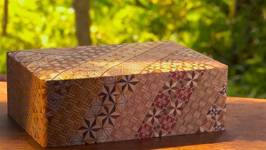 „First, timbers are cut into rods of desired sections, the rods are then glued together to form a section of geometrical design pattern. The surface is sliced into thin plates of wood, which are glued onto boxes and other handicraft works. This mosaic-like art originated during Japan’s Edo Period (17th-19th century) and are still respected all over the world.“