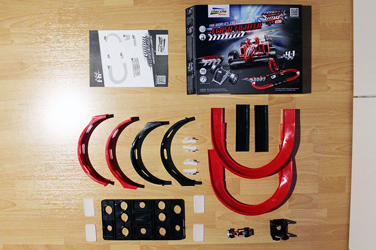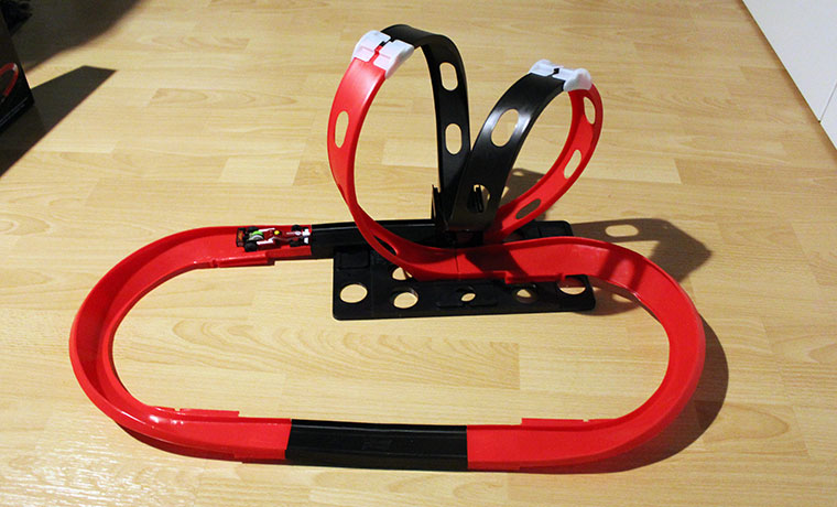 Fast genau so schnell ist der Aufbau der Strecke. Ich habe das Flash Fighter-Set zum Testen erhalten. Ein Formula-Rennwagen auf einer 3-Meter-Strecke inklusive Doppel-Looping. UVP: 29,99 €. Das ist so ein fairer Preis, dass man keineswegs sauer darüber sein darf, dass die Rennbahn eben doch recht rudimentär aus einfachen Plastik-Teilen besteht. Und auch wenn es sich zunächst nicht ultrahochwertig anfühlt, hat es seinen Sinn – die Teile müssen nämlich flexibel sein. So kann man die Loopings auf unterschiedliche Weise aufbauen und vier vorgegebene Varianten der Strecke aufbauen. Ist die Konfiguration erfolgt, hat die Bahn auch einen erstaunlich stabilen Sitz.