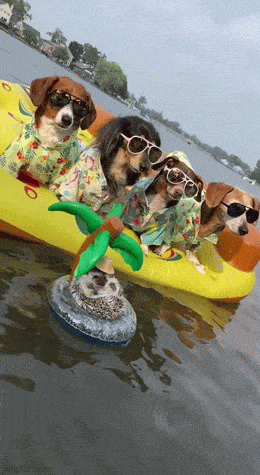 Hintergrund-Erklärung: Leider schreit das Wetter aktuell ja nicht wirklich nach einem Ausflug zum See. Wobei – ist ja eh Mittwoch, soll das Wetter doch lieber besser sein, wenn man frei und auch die Zeit hat! Hunde haben halt immer frei, was echt beneidenswert ist. Dazu sind die hier auch noch extrem cool aufgelegt. Die Show stiehlt dem sonnenbebrillten Quartett aber definitiv der kleine Igel. Dabei stellen sich mir gleich mehrere Fragen: Wie viel Vertrauen wird bitte in dessen kleinen Floatie gesteckt, dass man meint, der zerplatzt nicht?! Gibt es den coolen Sonnenhut auch in meiner Größe? Wieso hat er seine eigene Insel – haben die Hunde ihn von ihrer riesigen, aufblasbaren Pizza verstoßen? Da wäre doch noch genug Platz drauf gewesen!! Und können Igel eigentlich schwimmen? Tatsächlich ja, aber sie sind wohl wasserscheu und Gewässer können dennoch zur Todesfalle werden. Also bleib bitte auf deiner kleinen Rettungsinsel, Kleiner!