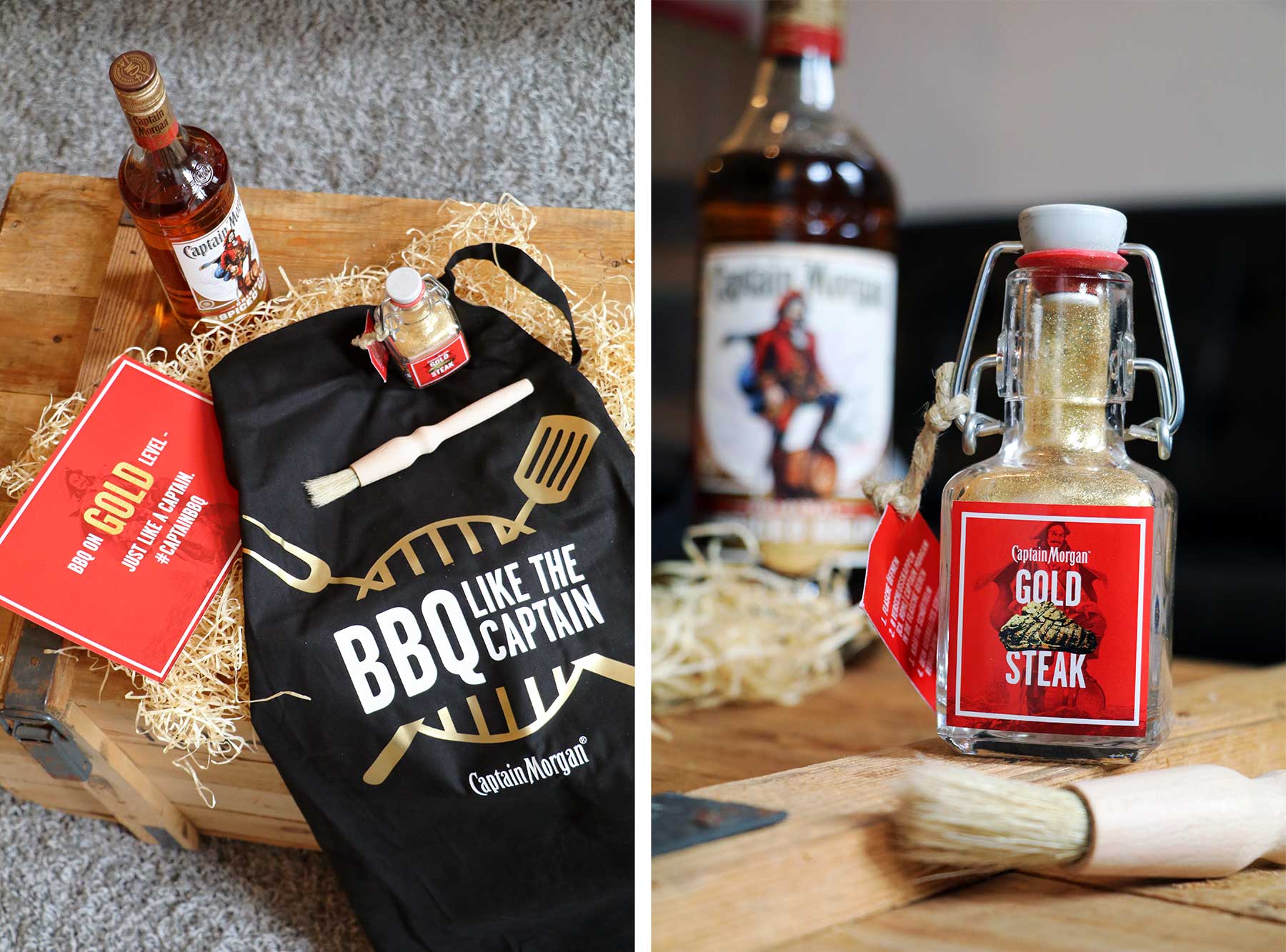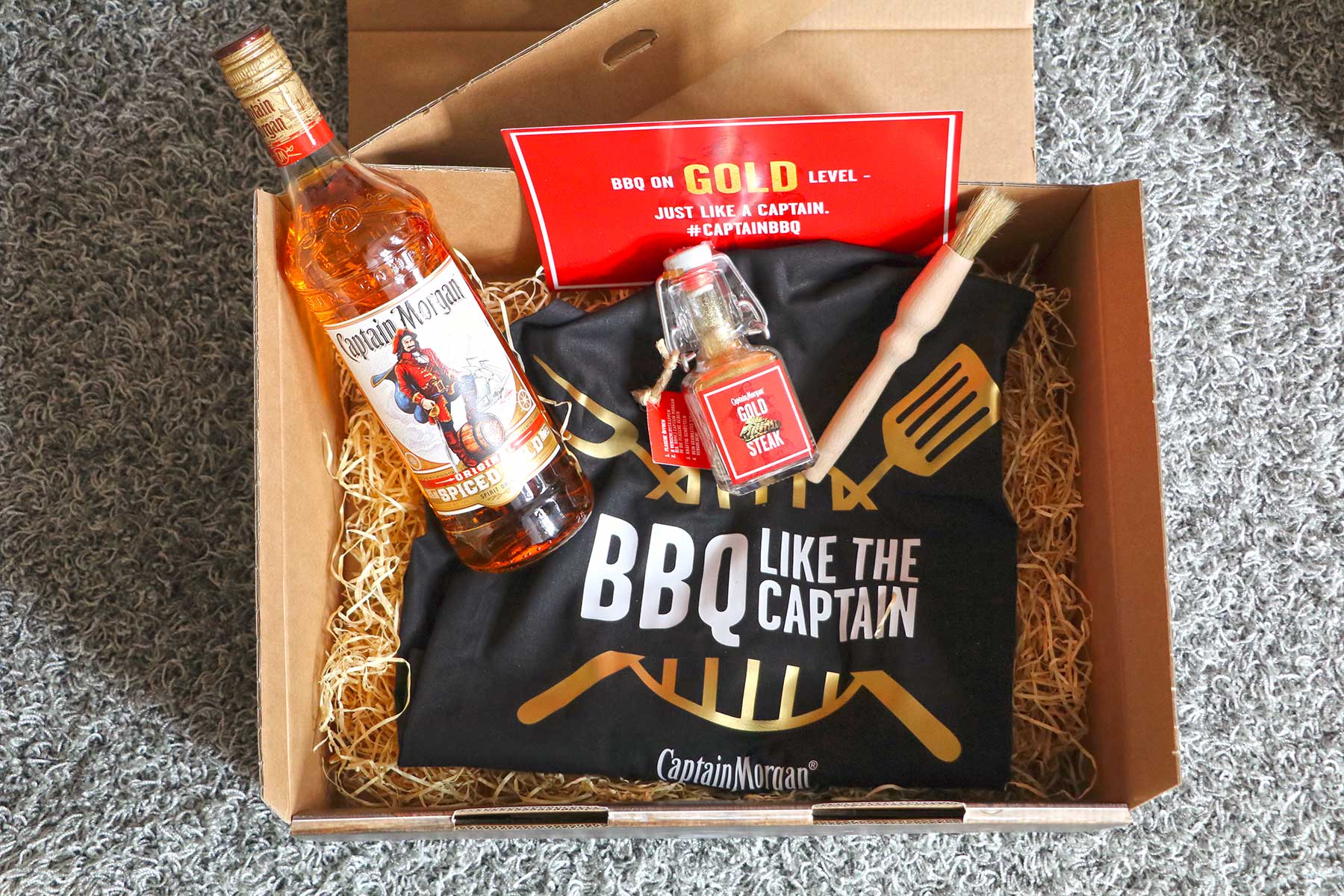 Darin enthalten sind: Eine Flasche Captain Morgan Original Spiced Gold Rum, ein Fläschchen Goldpulver, einen Grillpinsel zum Verreiben, eine stylische Kochschürze, die euch zum absoluten Captain am Grill oder wahlweise Herd werden lässt, und jede Menge Stroh.