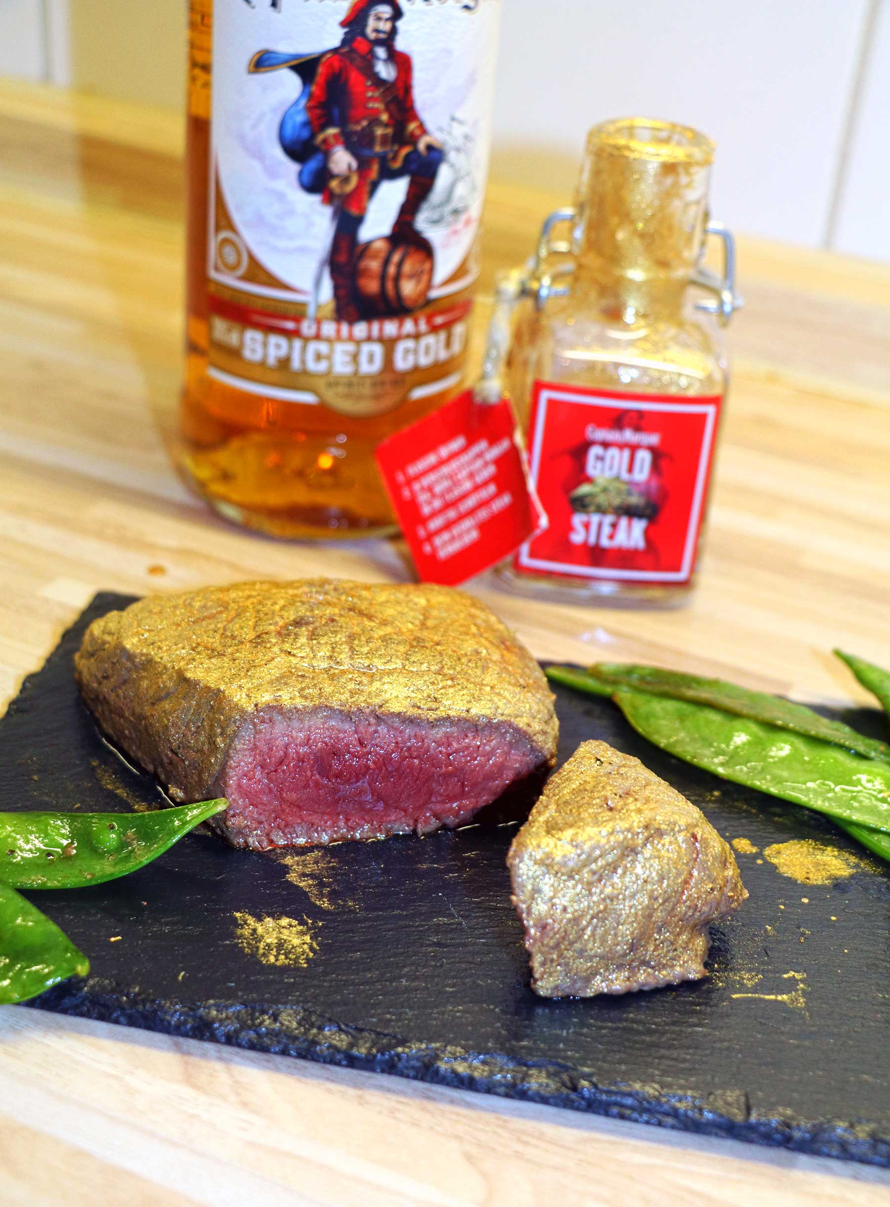 Für kurze Zeit gibt es die sensationelle „Gold Spiced Grillsauce“ von Captain Morgan. Dem kleinen Fläschchen mit Goldpulver darin (harmlose Lebensmittelfarb-Pigmente) fügt ihr einfach einen Schuss „Captain Morgan Original Spiced Gold Rum“ zu, schüttelt kräftig, und fertig ist die alles vergüldende Marinade (und damit meine ich ALLES, denn meine Finger glitzern beim Schreiben dieses Beitrages, aber ich war auch sehr doof und habe die Flasche zwischenzeitig nicht richtig zugemacht und geschüttelt…). Damit könnt ihr euer Steak nach dem Grillen einpinseln und in ganz neuem Glanz erstrahlen lassen, da verblassen nicht nur Fußballstars vor Neid!