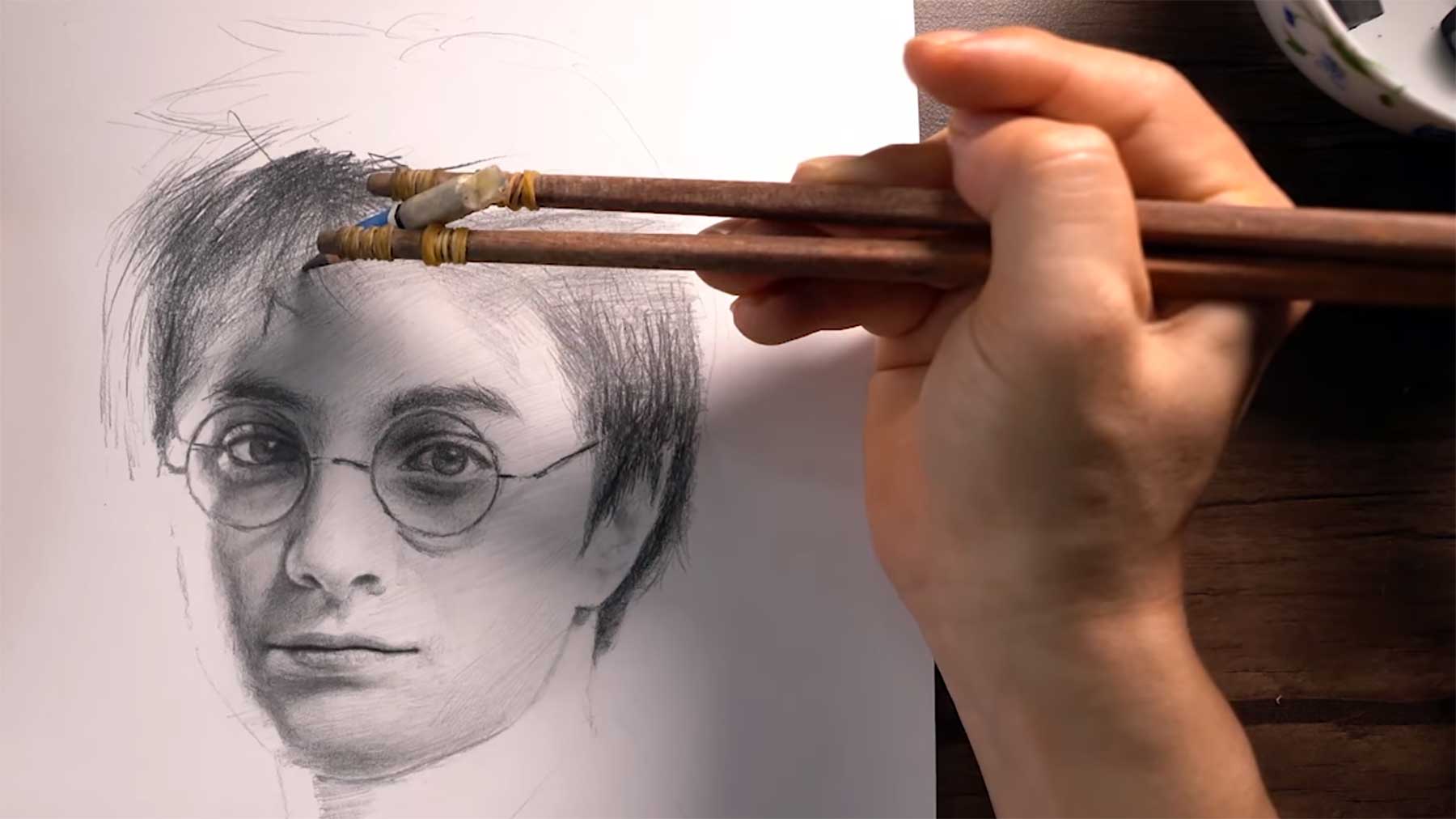 „I use chopsticks to hold a pencil and draw . I use a pair of chopsticks to draw Harry Potter portraits , Holding a pencil with chopsticks for a long time makes my hands very tired „