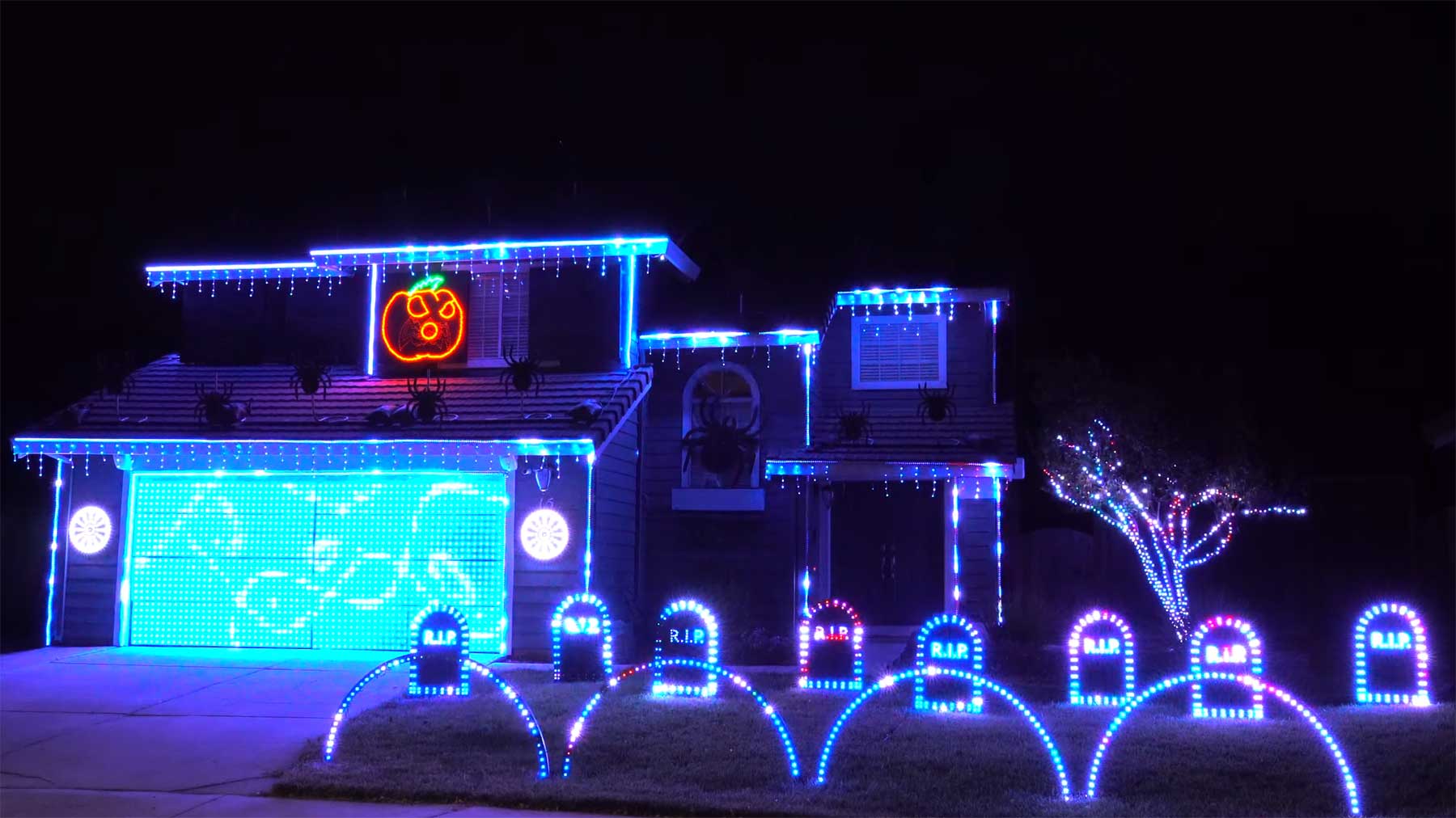 Vergangenes Jahr hat das Haus von Tom BetGeorge an Halloween noch zu Michael Jackson getanzt, dieses Mal geht es den Ghostbusters an den Kragen. Die von Ray Parker Jr. gesungene Titelmelodie hat eine astreine Licht-Choreografie erhalten. Man achte dabei vor allem auf dieses krasse LED-Garagentor!