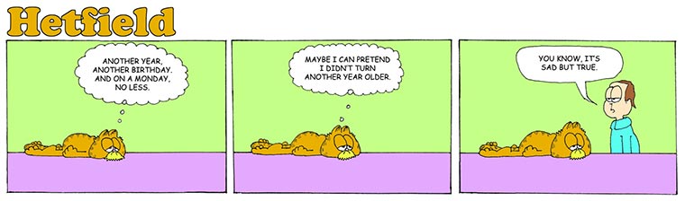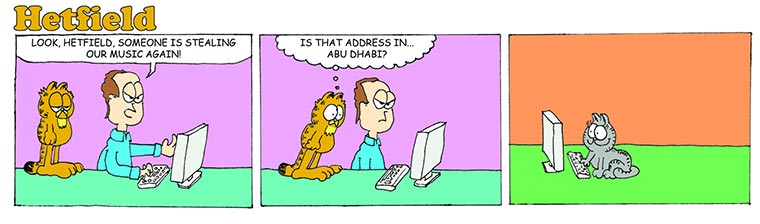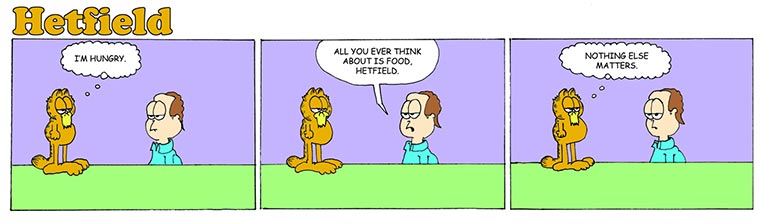 Die erste Grumpy Cat der Popkultur hat so dermaßen viel auf den ersten Blick mit Metallica-Frontmann James Hetfield gemein, dass man sich wundert, diese Kombination erst jetzt zu sehen. Hetfield ist die ideale Mixtur aus montagsmisstrauischer Rabauken-Mentalität mit Vorliebe für italienische Teiggerichte und – Garfield.