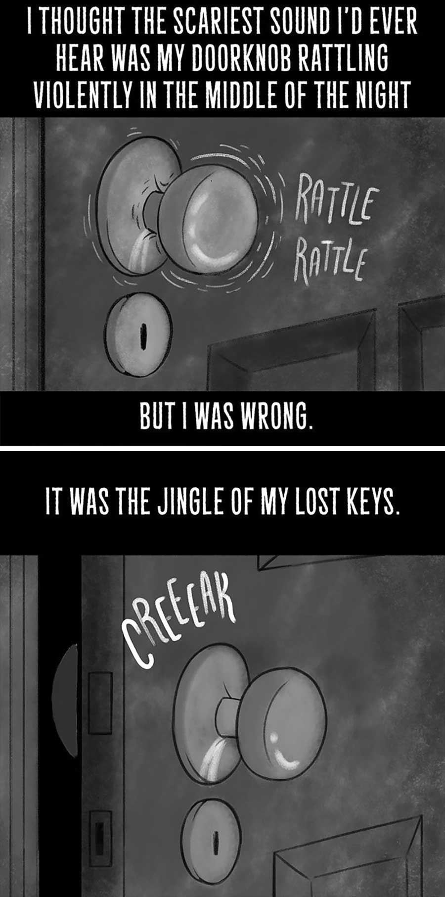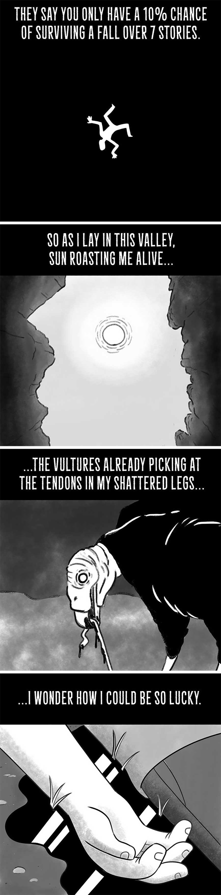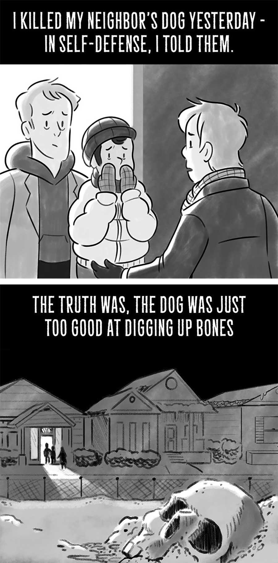 Für einen großen Twist reichen manchmal ganz kleine Dinge. Da braucht es keine 900 Seiten Roman oder 110 Minuten Film vorab. Einfach eine gesetzte Informations-Basis, die durch das Hinzunehmen einer weiteren Informationen einen anderen Betrachtungswinkel erhält. Das ist natürlich einfacher gesagt als erdacht, aber aktuell sprudeln bei Reddit im Subthread TwoSentenceHorror nur so Ideen. Seine fünf Favoriten hat CollegeHumor-Illustrator Jacob Andrews als Basis für kleine Visualisierung in Comic-Form genommen. Da sind ein paar sehr schöne Twists bei!