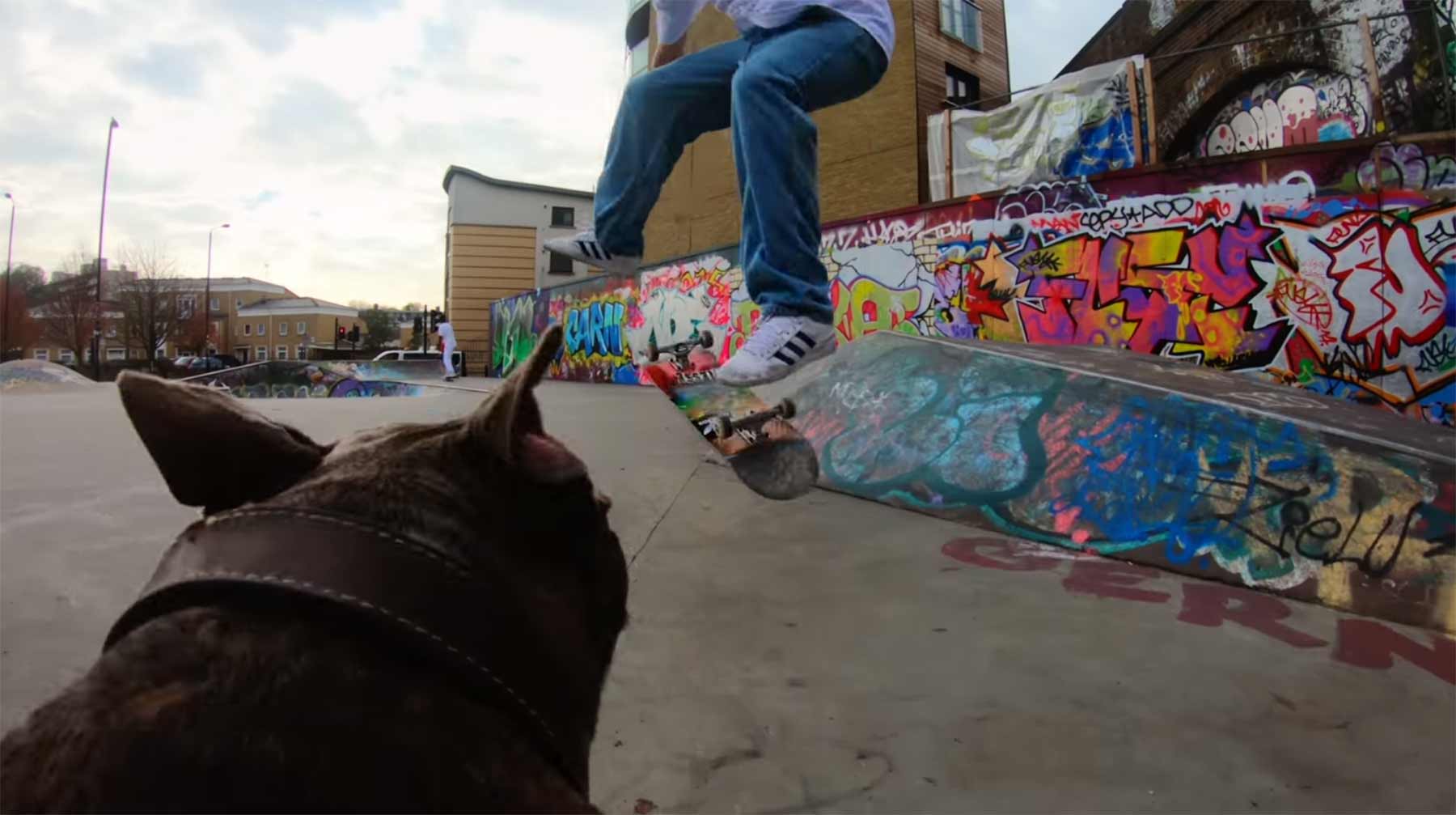Etwa seit Anbeginn des Skateboard-Sports galt auch immer die Frage, wie man ihn denn möglichst cool filmisch in Szene setzt. Gerade die Dynamik des schnellen Sports einzufangen, ist nicht immer einfach, oftmals wird dabei auf die Hinter-/Nebenher-Kamerafahrt eines weiteren Riders gesetzt, der auf dem eigenen Brett Geschwindigkeit und Bildstabilität halten soll. Aber wozu der ganze Aufwand, wenn man dank modernster digitaler Bildstabilisierungen nicht auch einfach einen Hund hinterherhetzen kann? Das ist auch gleich viel charmanter und interessanter!