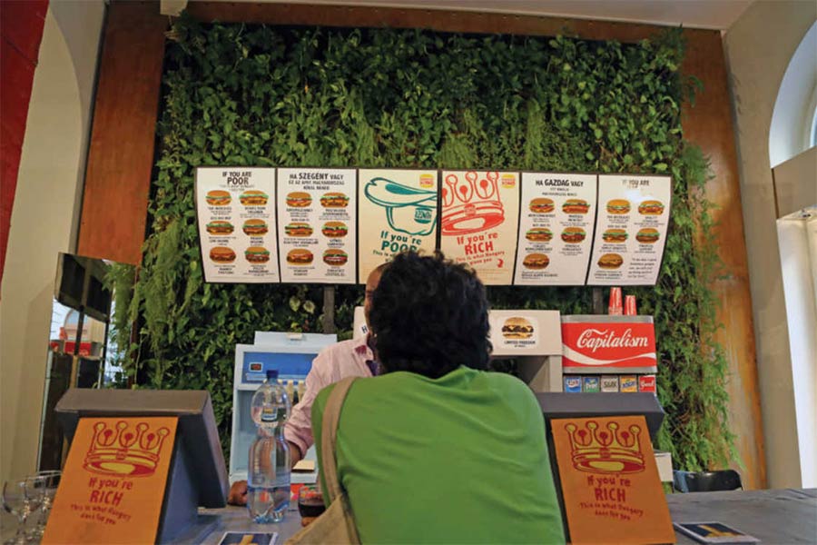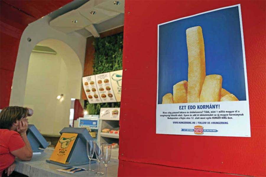 Jani Leinonen mag den Kapitalismus nicht. Zumindest deren knallbunten und extremen Auswürfe. Wenn eine lange Schlange von Leuten vor dem neu eröffneten Fast Food-Laden wartet und ebenso viele weniger Glückliche nebenan an der Speiseausgabe für Minderbemittelte, kommt es ihm hoch. Um Aufmerksamkeit für die steigende Diskrepanz zwischen Arm und Reich zu schaffen, hat er „Hunger King“ entwickelt. Eine Kunst-Installation, die Reiche mit rotem Teppich begrüßt – Arme (unter 2.300 Euro Monatseinkommen…) müssen dagegen stundenlang anstehen, um dann 13 Euro in einer Burgerbox zu erhalten, was dem Mindestlohn in Ungarn entspricht, wo er diese Aktion 2014 durchgeführt hat.