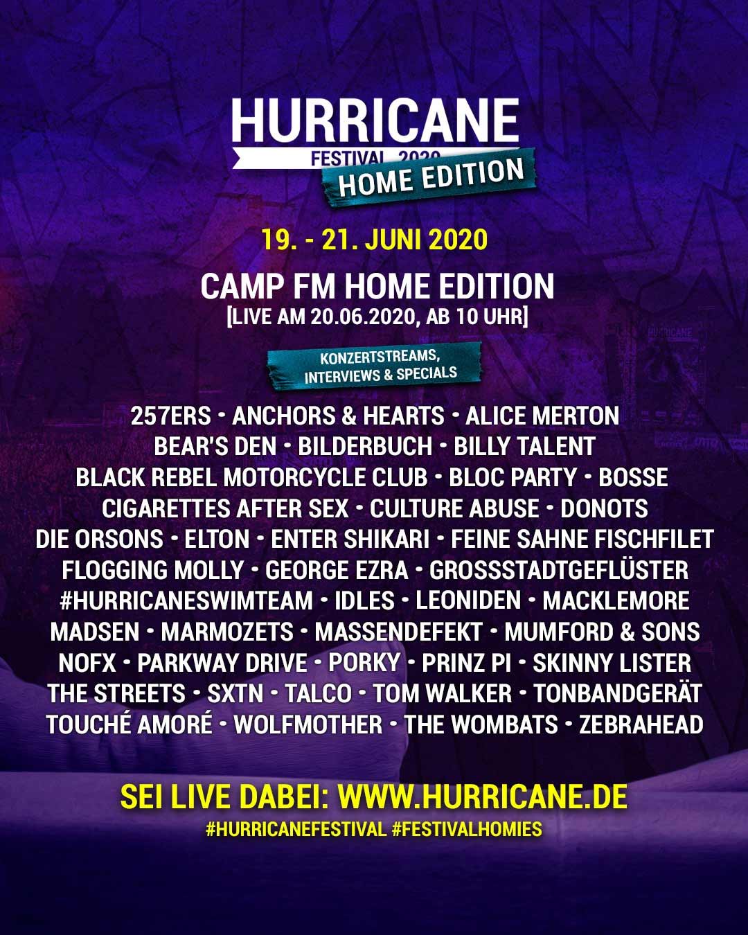 „Hurricane Home Edition upon y‘all! Zusammen mit dem NDR, ARTE Concert und unserem Festivalradio Camp FM haben wir ein amtliches Programm für das kommende Wochenende zusammengeflext! Freut euch auf über 30h feinste Unterhaltung mit zahlreichen Konzertaufzeichnungen, Interviews und einige Überraschungen – die genauen Tage und Uhrzeiten verraten wir euch im Laufe der Woche.“