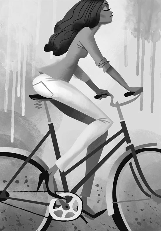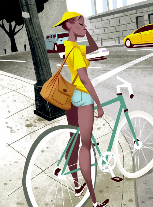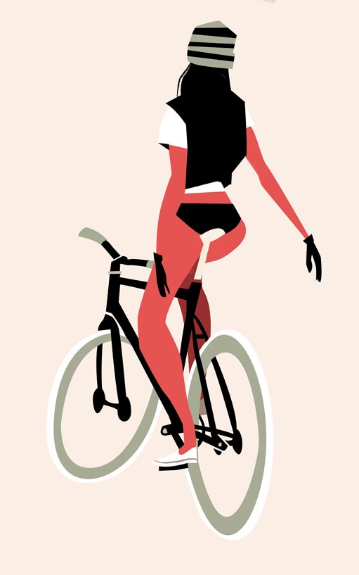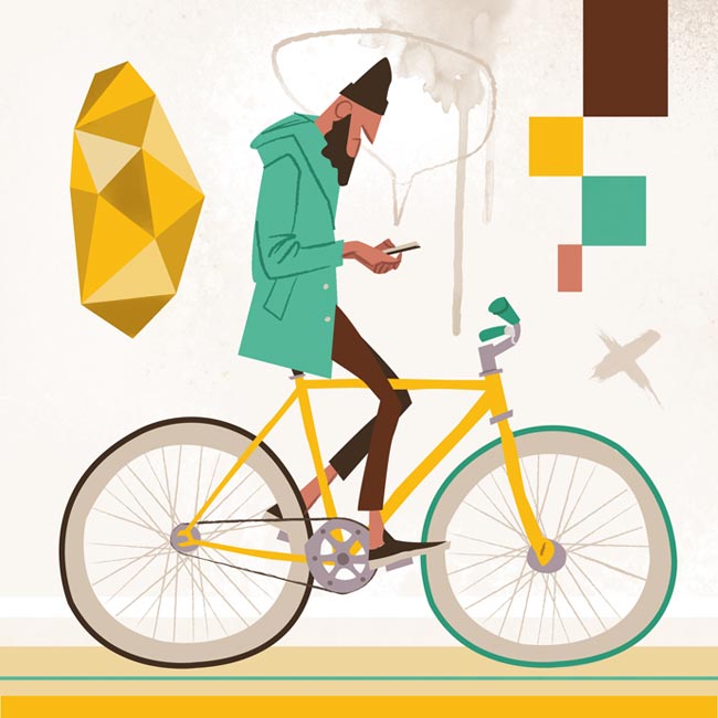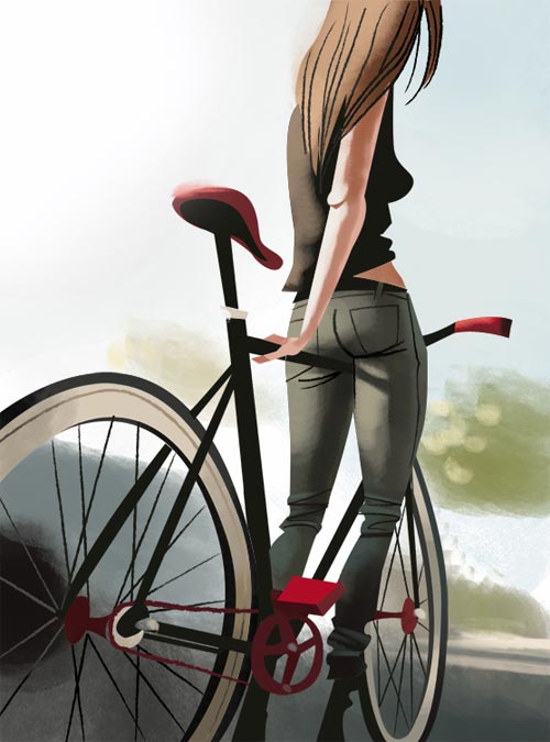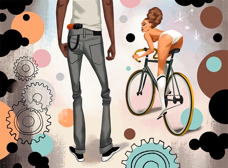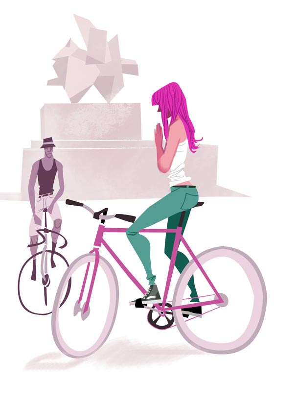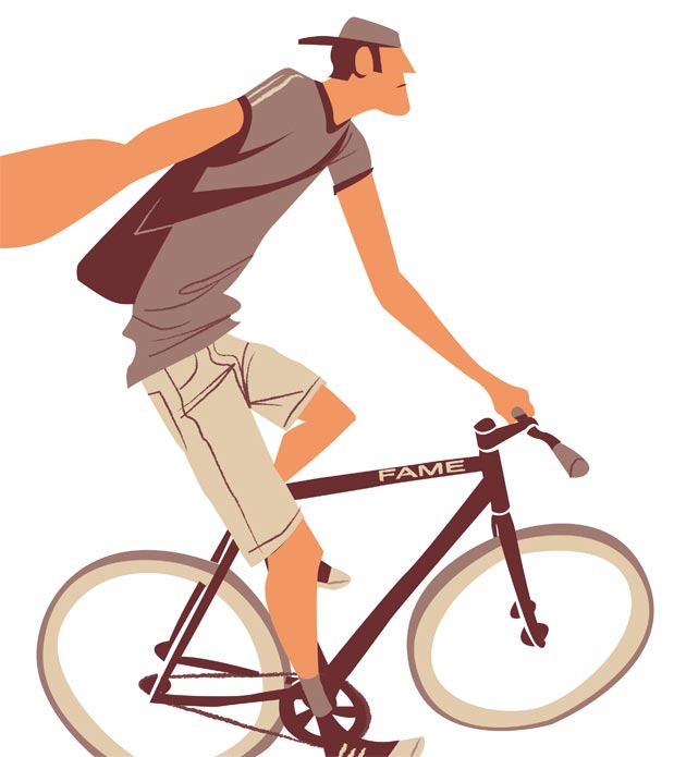 Der deutsche Illustrator Thorsten Hasenkamm mag Fixies sehr gerne. Oder er kann einfach keine Gangschaltungen zeichnen. Beides verständlich. Jedenfalls finden sich in seinem Portfolio allerlei Figuren, Charaktere und Personen, die auf Fahrrädern mit genau einem Gang unterwegs sind. Oder es schieben. Oder daran angelehnt sind. Total abwechslungsreich also.