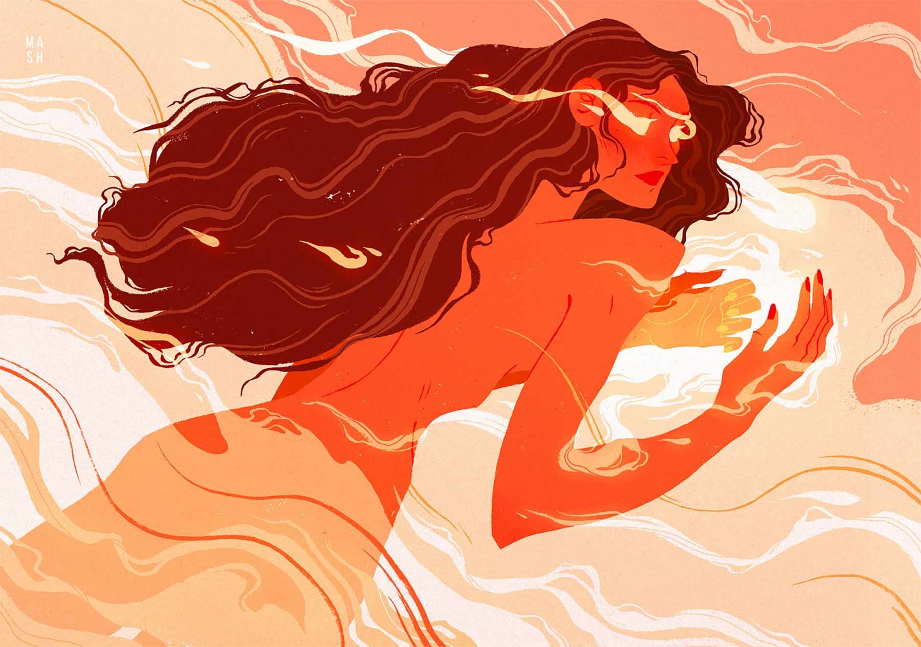 „Samantha Mash grew up in the dry marsh area of Palo Alto, California. After graduating high school she headed north to forested Portland, Oregon where she has resided ever since. Samantha currently works as a freelance illustrator and illustration instructor at Pacific Northwest College of Art. She is open to email inquiries for commercial work, gallery exhibitions, and other creative projects. Samantha is interested in the place of iconography within her illustrative work. Her art is heavily focused on symbolism and the human form which she uses to explore concepts of vulnerability, identity, anxiety, repression, and freedom. She is currently focused on pushing the space between line work, shapes, and light to create a sense of fluidity, color, and form. Her outside interests include ecology, conservation, and social equity; all of which she is actively pursues in her free time both within and outside of her artistic practice.“ (Artist Statement)